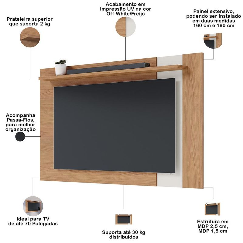 Conheça o conjunto de Rack Bancada Makai e Painel Para TV Lara, da Lyam Decor, e tenha uma sala de estar moderna como sempre sonhou. O design com linhas retas e a combinação das tonalidades sóbrias fazem desse rack com painel o ponto-alto de qualquer ambiente; afinal, estética e funcionalidade devem estar juntas, como pode ser observado na ampla bancada com nichos para aparelhos eletrônicos e, ainda, com uma adega para 6 garrafas; além dos pés em madeira maciça estilo retrô que conferem charme e estabilidade. Já o painel para tv 70 polegadas completa o visual do ambiente, servindo como moldura para o televisor, ao passo que a prateleira superior adiciona um acabamento impecável ao mesmo tempo que serve de apoio para itens decorativos. Em outras palavras, um conjunto para sala estar completo perfeito para quem tem gosto exigente. Adicione ao seu carrinho e surpreenda-se! Dimensões total do Rack Makai (L x A x P) 180 x 64 x 36,5 cm Medidas Internas do Rack Makai Altura nichos adega: 12 cm Altura dos pés: 20 cm Nichos laterais para eletrônicos (L x A): 49,4 x 12 cm Características do Rack Makai: Estrutura em MDP 25mm, MDP 15mm, MDF 25mm, MDF 15mm, HDF 3mm. Peças na cor Off White Matte e Freijó com acabamento em pintura UV fosco. Ideal para TV de até 70 polegadas. 02 Portas de giro chanfradas com fecho toques e dobradiças metálicas. 03 nichos laterais para aparelhos eletrônicos. Nicho adega para até 6 garrafas. Acompanha passa fios, para melhor organização. Pés em madeira maciça estilo retrô, levemente angulados. Suporta até 47 kg distribuídos. Dimensões total do Painel Lara (L x A x P) 180 x 108 x 18 cm Medidas Internas do Painel Lara Largura livre para TV: de 160 a 180 cm Altura livre para TV: 95,5 cm Largura da prateleira: 154 cm Características do Painel Lara: Estrutura em MDP 25mm, MDP 15mm. Peças na cor Off White Matte e Freijó com acabamento em pintura UV fosco. Ideal para TV de até 70 polegadas. Painel extensivo, podendo ser instalado em duas medidas: 160cm e 180 cm. 01 Prateleira superior que suporta 2 kg. Acompanha passa fios, para melhor organização. Suporta até 30 kg distribuídos. - Produto entregue desmontado, acompanha manual de montagem. Sistema de montagem: Cavilhas, parafusos, girofix. - Este produto deve ser limpo com pano macio e seco. Não utilize produtos abrasivos como álcool e detergente, assim como esponjas rígidas ou palha de aço. - Proteja a superfície do móvel de objetos que transmitam calor ou umidade. Observações importantes: - Produto para uso residencial em ambiente interno, não devendo ficar exposto diretamente ao sol, calor e umidade excessivos. - Pode haver alguma diferença de tonalidade entre a imagem e o produto real, por conta do tratamento de imagens e a calibração de cores do seu monitor. - As imagens são meramente ilustrativas, não acompanham objetos de decoração e eletrônicos. - Ao receber a mercadoria, o cliente deve verificar as condições da embalagem, caso haja alguma avaria não assine o comprovante de recebimento. - Montagem, desmontagem e outras instalações serão de responsabilidade do cliente. Não nos responsabilizamos, no ato da entrega, por subir escadas/elevadores ou pelo transporte por guincho em apartamentos. Eventuais despesas são de responsabilidade do comprador. - Confira as dimensões do produto e certifique-se de que passará normalmente por supostos elevadores, portas, escadas e/ou corredores de sua residência.