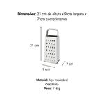 Prático e eficiente, o Ralador de Quatro Faces em Aço Inox 21cm é ideal para quem busca agilidade e versatilidade no preparo dos alimentos. Produzido em aço inox de alta durabilidade, garante resistência ao desgaste e não enferruja, mantendo o brilho e a aparência de novo por muito mais tempo. Possui quatro superfícies com diferentes tipos de corte fino, médio, grosso e fatiador, perfeitas para ralar queijos, legumes, frutas, chocolates e muito mais, atendendo às mais variadas receitas. Seu design funcional com alça ergonômica oferece firmeza e segurança durante o uso, tornando o processo mais confortável e preciso. Fácil de limpar e prático para o dia a dia, é um utensílio indispensável em qualquer cozinha.Especificações:Dimensões: 21cm de altura x 9 cm largura x 7 cm comprimentoMaterial: Aço InoxidávelCor: PrataPeso: 116 gContém:01 Ralador de Quatro Faces em Aço Inox 21 cm