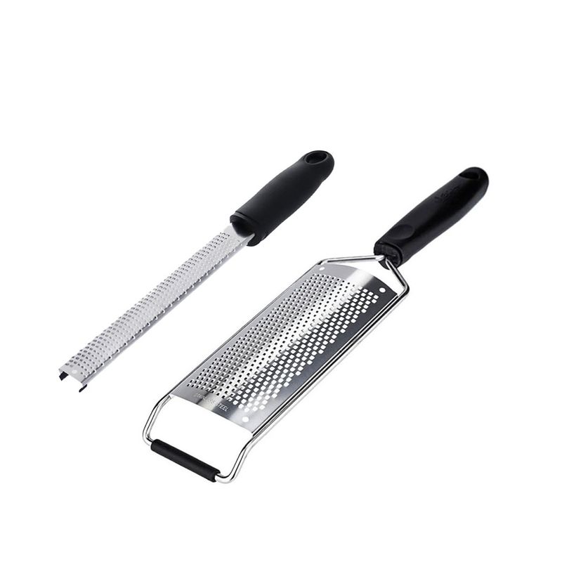 Ralador antiderrapante e zester. Os raladores sao perfeitos para ralar cascas de citricos, como limao, laranja, alem de queijos, cenouras, cebolas e outros legumes. Com laminas super afiadas, com esforço minimo tem um resultado impressionante. Com ponta antiderrapante, evita que a peça deslize na bancada. O Ralador Zester, proprio para tirar finas raspas de cascas de limao, laranja, frutas citricas e especiarias. Seu formato estreito, ocupa pouco espaço dentro da gaveta. Perfeito para finalizar seus pratos com noz moscada, raspa de limao, queijo parmesao e outros. Contem: 1 Ralador Zester Medidas: 32 x 3,5 cm 1 Ralador Antiderrapante Dimensão: 30 x 7,5 cm Material: Aço inox e polipropileno