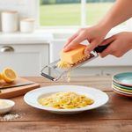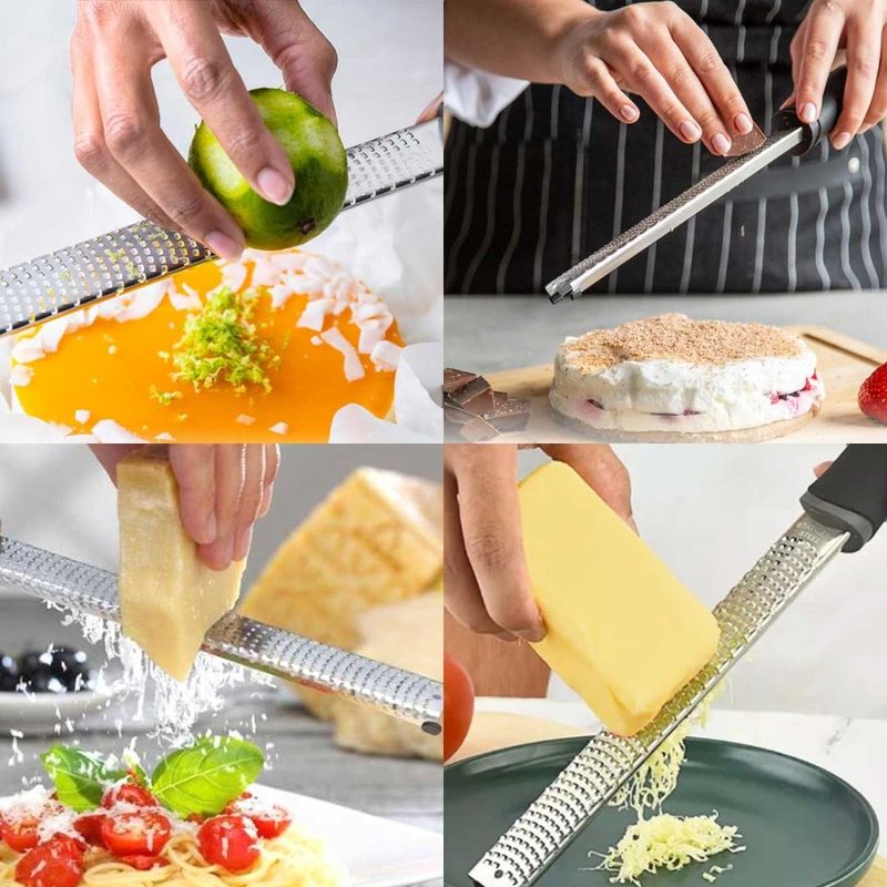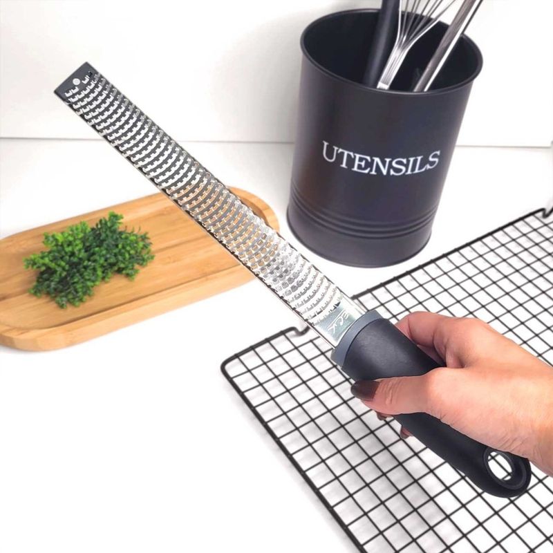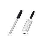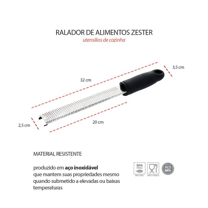 Ralador antiderrapante e zester. Os raladores sao perfeitos para ralar cascas de citricos, como limao, laranja, alem de queijos, cenouras, cebolas e outros legumes. Com laminas super afiadas, com esforço minimo tem um resultado impressionante. Com ponta antiderrapante, evita que a peça deslize na bancada. O Ralador Zester, proprio para tirar finas raspas de cascas de limao, laranja, frutas citricas e especiarias. Seu formato estreito, ocupa pouco espaço dentro da gaveta. Perfeito para finalizar seus pratos com noz moscada, raspa de limao, queijo parmesao e outros. Contem: 1 Ralador Zester Medidas: 32 x 3,5 cm 1 Ralador Antiderrapante Medidas: 29,5 x 6,5 cm Material: Aço inox e polipropileno