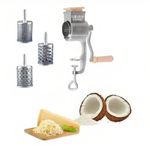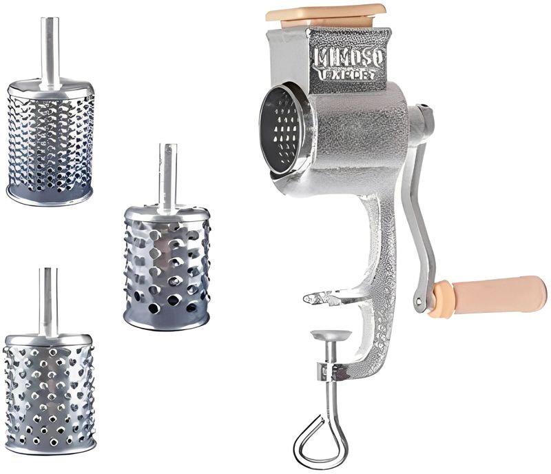 Máquina de ralar coco e queijo. O ralador de coco e queijo multiuso com 3 ralos da Mimoso é de fácil manuseio. Ele possui sistema de fixação prática que permite travar o ralador em qualquer superfície plana. É uma máquina de ralar alimento, segura e higiênica. Feita para quem precisa de agilidade na hora de ralar os alimentos. Suas peças podem ser desmontadas e lavadas! Utilizado: ralar coco, queijos, legumes, sabão caseiro(pedra) e outros. DIMENSÕES: Peso = 2200g, Copo de entrada 45x55mm. CARACTERÍSTICAS TÉCNICAS: Corpo e manivela em ferro fundido estanhado. Ralo em folha de flandres. Soquete em polietileno injetado. ACOMPANHA: 3 ralos: Pó, Filetes e Lascas (Fino, Médio e Grosso).Marca: Mimoso