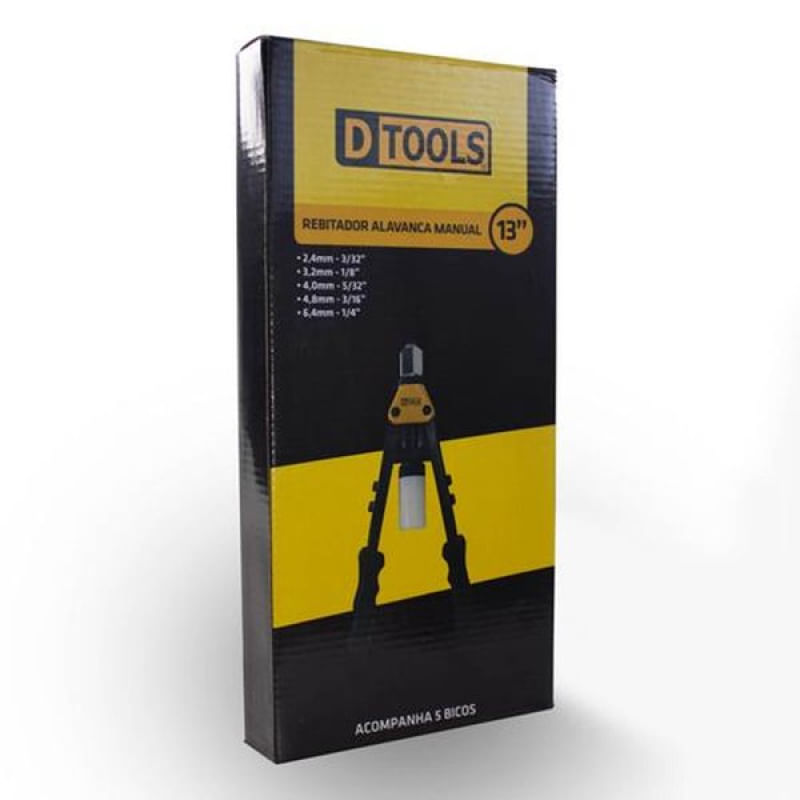 Rebitador Manual 13'' Alavanca para Rebites 2.4/3.2/4.0/4.8 - DTOOLS - REBITADOR MANUAL 13'' ALAVANCA - DTOOLSDESCRIÃÃO PERSUASIVA:O Rebitador Manual 13'' Alavanca - DTOOLS é a ferramenta ideal para quem busca praticidade e eficiência em suas atividades. Com sua estrutura leve e resistente, este rebitador foi projetado para uso intensivo e contÃnuo, proporcionando menor esforço e maior produtividade. Além disso, conta com um reservatório especial para armazenar o arame do rebite, garantindo praticidade durante o trabalho. Seja para rebites de 2.4, 3.2, 4.0 ou 4.8, este rebitador é a escolha perfeita para quem busca qualidade e durabilidade em suas ferramentas.RESUMO EM DESTAQUES:- Leve e resistente- Ideal para uso intensivo e contÃnuo- Menor esforço e maior produtividade- Reservatório especial para armazenar arame do rebite- Para rebites de 2.4 / 3.2 / 4.0 / 4.8INFORMAÃÃES TÃCNICAS:- Marca: DTOOLS Universo do Lar- Modelo: Rebitador Manual 13'' Alavanca- Tamanho: 13 polegadas- Indicado para rebites de: 2.4 / 3.2 / 4.0 / 4.8- Material: Aço resistente- Cor: PrataGARANTIA:Garanta já o seu Rebitador Manual 13'' Alavanca - DTOOLS Universo do Lar e tenha a certeza de estar adquirindo um produto de qualidade e durabilidade. Sua satisfação é garantida! -------- Descrição Original enviada pelo Fornecedor: REBITADOR MANUAL 13'' ALAVANCA - DTOOLSLeve e resistente para uso intensivo e contÃnuo com menor esforço e maior produtividadeReservatório especial para armazenar arame do rebite (sucata)Para rebites de 2.4 / 3.2 / 4.0 / 4.8 Características Gerais do Produto: Garantia: • 3 meses