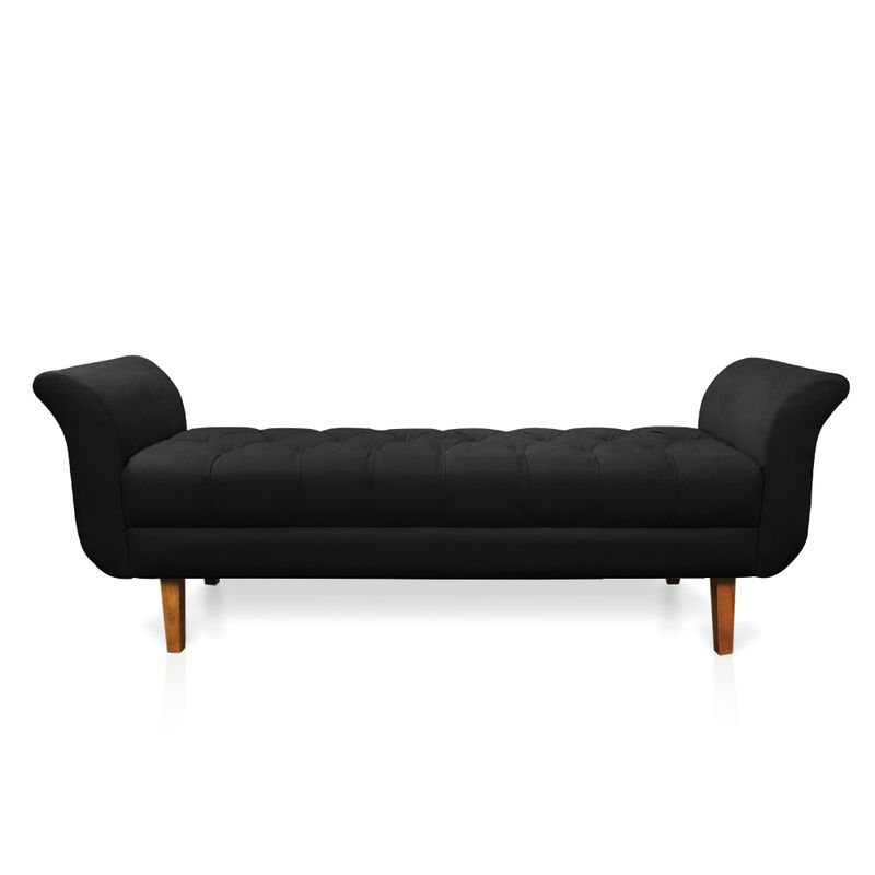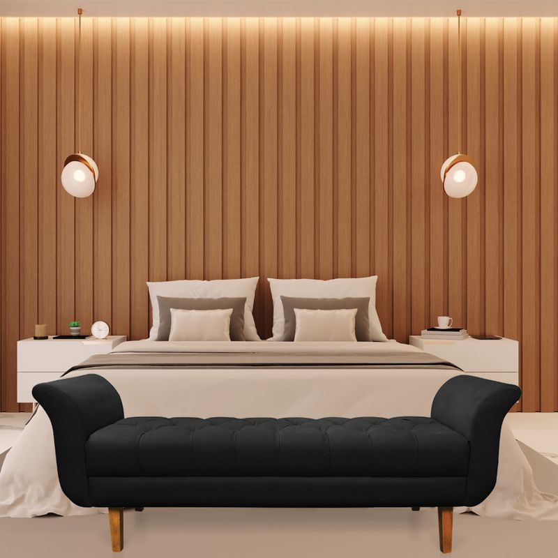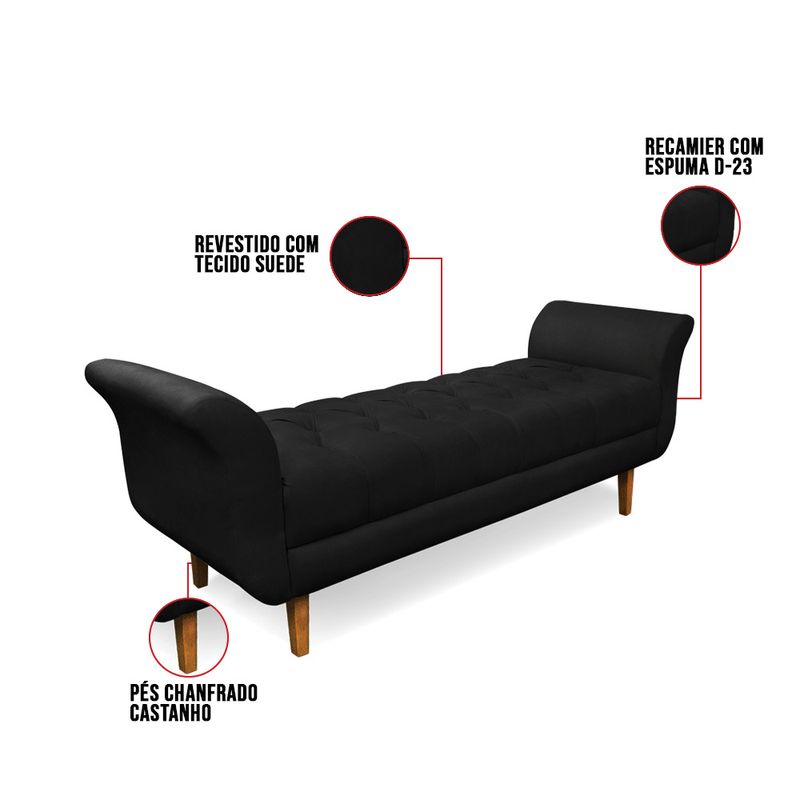 O Recamier Olinda é uma tendência da decoração atual que pode ser muito bem-vinda em diversos ambientes, como quarto, sala, escritório, hall de entrada, etc. Um conceito moderno e usual que pode servir de apoio na frente da cama, contém um assento ótimo para relaxar nos momentos de descanso e leitura. Viu só como ele é prático e multifuncional! Tem mais, ele conta com um design todo expressivo, o charme fica por conta de vários fatores: Das curvas sinuosas dos braços, assento em botonê e para completar este lindo móvel, os pés são chanfrados, o que lhe confere elegância e rusticidade. Sua estrutura é produzida em madeira de eucalipto proveniente de reflorestamento, suportando em média até 180 Kg, o estofamento é feito com espuma D-23. Revestido no Suede no tom Preto, um tecido super resistente e fácil de limpar. Uma peça clássica que vai dar um toque todo especial ao seu dormitório. Não perca tempo e leve o Recamier Olinda para a decoração da sua casa! Dimensões Recamier: Altura total: 62 cm Largura total: 160 cm Profundidade total: 54 cm Peso: 17 kg Especificações do Produto Estrutura: Madeira Eucalipto Espuma: D-23 Tecido: Suede Pés: Pés Chanfrado Castanho Garantia: 90 dias contra defeito de fabricação Necessita Montagem: O produto vai montado, apenas fixar na parede Instruções de limpeza: Utilizar um pano limpo e levemente úmido Você irá receber: 01 Volume com 01 Recamier Observações Relevantes - Todos os produtos vão embalados com total segurança; - As cores dos produtos podem sofrer alterações dependendo do seu monitor; - Para futuras compras, não garantimos a mesma tonalidade de cor, pois existe variação a cada lote do fabricante do tecido; - As imagens são meramente ilustrativas, não acompanham objetos de decoração e eletros; - Confira as dimensões do produto no momento da compra e certifique-se de que passará normalmente por escadas, elevadores, portas e corredores; - Importante: Por se tratar de estofado as medidas podem ter uma pequena variação em até 3 cm; - Não nos responsabilizamos no ato da entrega por montagens, desmontagens, instalações de produtos; - Não nos responsabilizamos no ato da entrega por subir escadas, elevadores, nem utilização de guinchos ou equipamentos similares para acesso a pisos superiores em apartamentos; - A entrega do produto é realizada em todo território nacional, até onde as rodovias alcançam, entregas fluviais ou aéreas devem ser cotadas a parte; - Observando as orientações acima, evita-se futuros desagrados ou imprevistos com a entrega do produto. Havendo despesas adicionais, serão de responsabilidade do cliente;