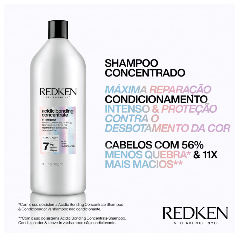 INFORMAÇÕES DO PRODUTO Acidic Bonding Concentrate - Shampoo O Shampoo Redken Acidic Bonding Concentrate é a fórmula mais concentrada da Redken para reparar a força de todos os tipos de cabelos danificados. Este produto oferece o máximo em reparo de força, condicionamento intenso e proteção contra desbotamento da cor. Além disso, contém um complexo de cuidado de ligação concentrado que reforça as ligações enfraquecidas no cabelo, melhorando a resistência e defendendo contra os efeitos negativos da coloração e ferramentas de modelagem. Conselho de Aplicação Para obter os melhores resultados, aplique o shampoo no cabelo molhado, massageie suavemente até formar espuma e enxágue bem. Se necessário, repita a operação para garantir que o cabelo esteja completamente limpo. A aplicação regular do produto contribui para a manutenção da saúde e força dos fios. Ação / Resultado O uso contínuo do Redken Acidic Bonding Concentrate proporciona uma transformação visível na qualidade do cabelo. Os fios se tornam mais fortes, resistentes e com uma aparência saudável. A coloração do cabelo é protegida, prolongando a vivacidade e o brilho. O resultado é um cabelo revitalizado, com toque sedoso e um aspecto brilhante e rejuvenescido.