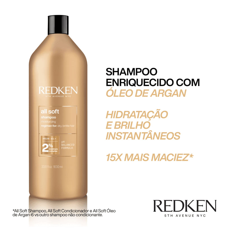 INFORMAÇÕES DO PRODUTO Redken All Soft Para cabelos secos e opacos. Hidratar da raiz às pontas profundamente e limpar os cabelos promovendo maciez, fáceis de pentear e com brilho intenso. Sua fórmula é enriquecida com Óleo de Argan, sua ação hidrata intensamente e adiciona brilho aos fios, promovendo a elasticidade e maleabilidade da fibra capilar.