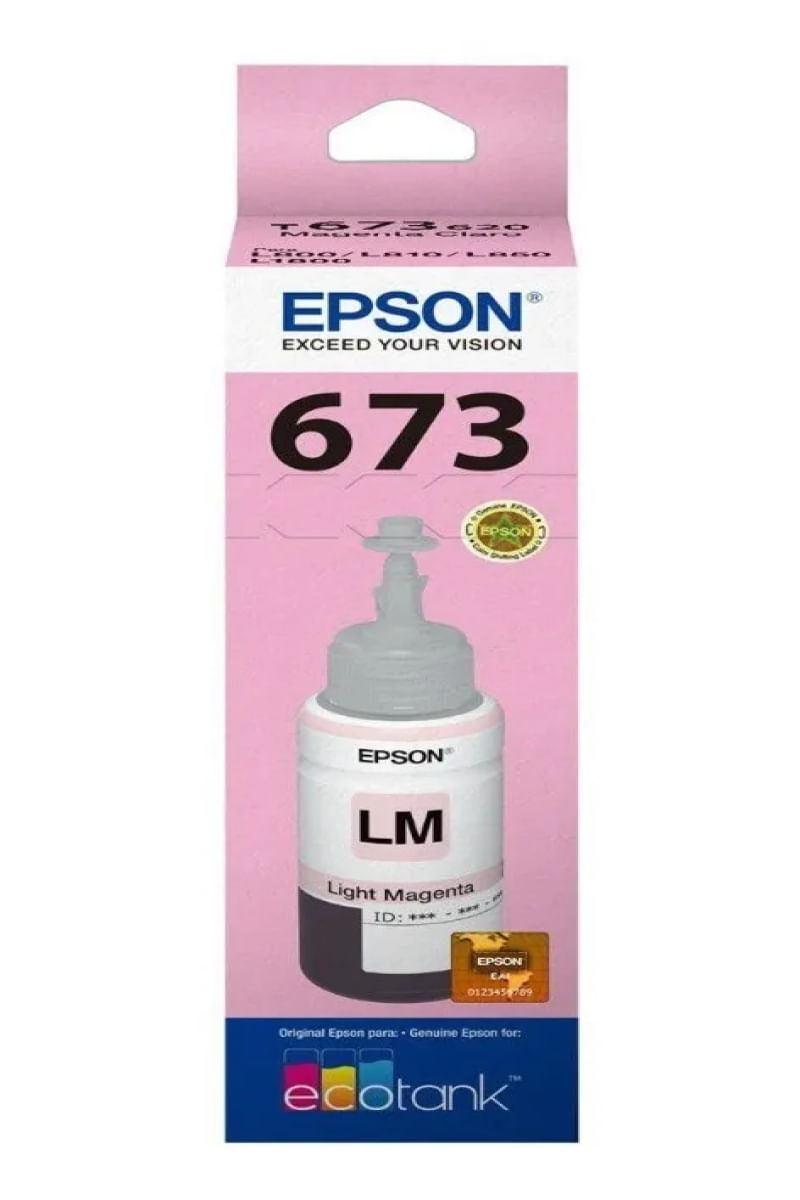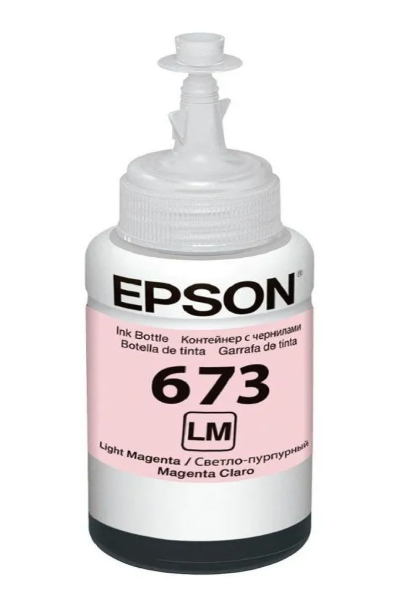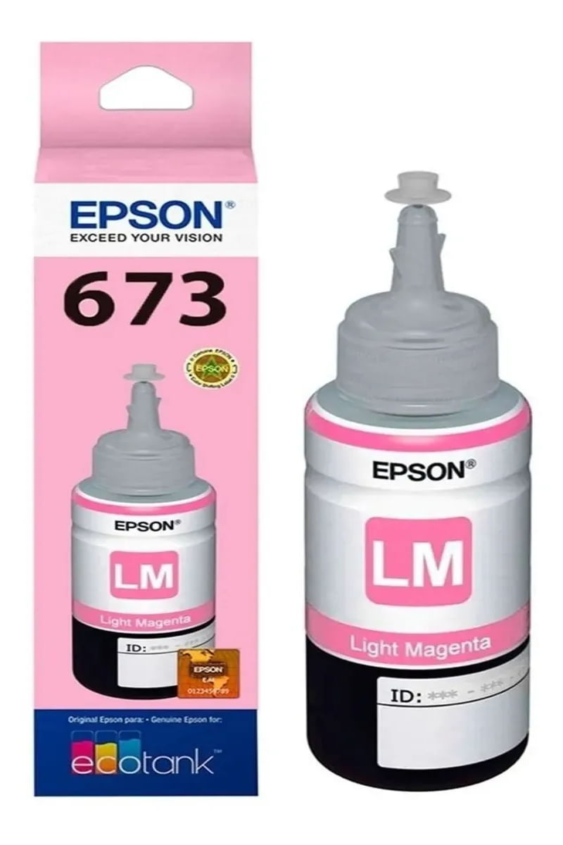 Garrafa de Tinta Epson T673620-AL Magenta Claro - OriginalAs tintas originais Epson são projetadas para trabalhar em perfeita sintonia, gerando impressões de alta qualidadeComo identificar Garrafas Originais?- Caixa lacrada com holograma- Garrafa embalada com plástico a vácuo- Logo Epson em relevo na tampa e no fundo da garrafaAo mover o holograma para a direita você vai ver: EPSONAo Mover o holograma para a esquerda você vai ver: GENUINEModelo do produto: T673Impressão: Magenta ClaroTecnologia de impressão: Jato de tintaNome de marca: EpsonRendimento Aproximado: 5.400 PaginasCompatibilidade:L800 / L805 / L810 / L850 / L1800Conteúdo da embalagem:- 1 x Refil de Tinta Epson T673