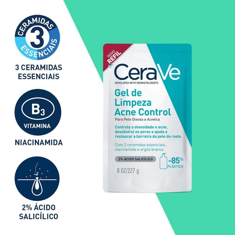Refil Gel de Limpeza Cerave Acne Control Pele Oleosa a Acneica 227g O Gel de Limpeza CeraVe Acne Control é um produto especialmente formulado para atender às necessidades de peles oleosas e acneicas. Sua ação eficaz remove a oleosidade e as impurezas, desobstruindo os poros enquanto restaura a barra Benefícios do Gel de Limpeza CeraVe Acne Control: Limpeza Profunda: Ideal para o uso diário, controla a oleosidade e combate a acne.Desobstrução dos Poros: Ajuda a prevenir o aparecimento de novas imperfeições.Barreira Protetora: Restaura e protege a pele, mantendo-a saudável.Fórmula Suave com Enxágue: Eficiente na remoção de sujeira e oleosidade, sem agredir a pele. Principais Ativos e Seus Benefícios: Niacinamida: Estimula a renovação celular e uniformiza o tom da pele.Possui propriedades antioxidantes e controla a oleosidade, prevenindo o envelhecimento.Argila Branca: Realiza um leve peeling superficial, clareando manchas e uniformizando o tom da pele.Elimina células mortas e promove a renovação celular.Ceramidas: Essenciais para manter a saúde da pele, ajudar a restaurar e proteger a barreira natural.Ácido Salicílico: Contribui para a renovação da pele, melhorando a textura e irregularidades. Como usar o Gel de Limpeza CeraVe Acne Control? Molhe o rosto antes da aplicação.Aplique o gel e massageie suavemente até formar espuma, evitando a área dos olhos.Enxágue bem com água morna.Dica: A sensibilidade ao sol pode aumentar durante o uso desteFrequência de uso: O gel pode ser usado diariamente, de manhã e à noite. Advertências: Uso externo.Não coma.Evitar contato com os olhos; caso ocorra, enxágue abundantemente com água.Não utilize em crianças.Suspenda o uso em caso de alergia ou alergia e consulte um médico.Armazenagem.Mantenha fora do alcance das crianças.
