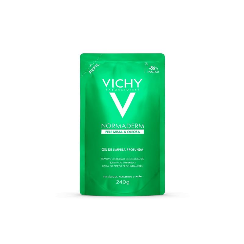Vichy Normaderm Gel Limpeza Profunda Refil 240g O Gel de Limpeza Profunda Vichy Normaderm foi desenvolvido para entregar os melhores resultados na remoção dos excessos de oleosidade e das impurezas no rosto. Sua fórmula é hipoalergênica, sem álcool, parabenos e sabão, limpa os poros profundamente removendo células mortas e impurezas, controla o brilho recorrente e substitui o sabonete líquido. Ideal para peles sensíveis, mistas a oleosas. Deixe o seu skincare melhor com esse gel de limpeza profunda!