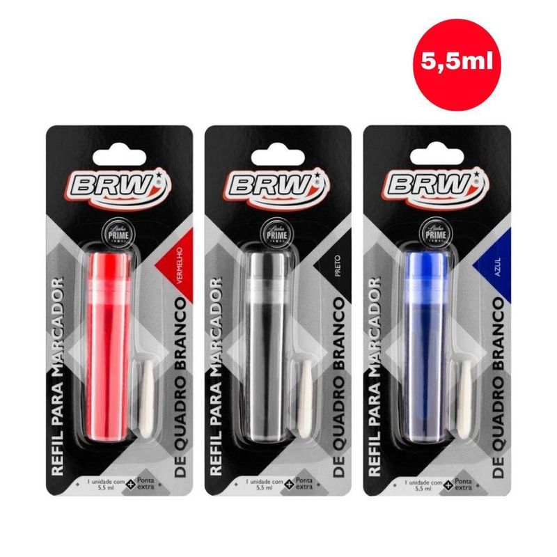 Refil Pincel Marcador Quadro Branco Reabastecedor + Ponta Extra Brw VermelhoRefil Pincel Marcador Quadro Branco Reabastecedor + Ponta Extra BRW Vermelho -Recarga prática e sem sujeira: Reabasteça seus pincéis de quadro branco de forma rápida e fácil, sem se preocupar com tinta derramada.Com o Refil Pincel Quadro Branco Reabastecedor + Ponta Extra BRW, você economiza dinheiro, ajuda o meio ambiente e dá nova vida aos seus pincéis de quadro branco!Ideal para: Professores, estudantes, profissionais, artistas e para uso doméstico.Acompanha ponta extra.Tamanho: 16 x 70mmPossui 5,5mL que proporciona carga em marcadores com praticidade e sem sujeira.Refil disponível em 3 cores: azul, preto e vermelho.Características Gerais do Produto:Acompanha o produto: - 1 Refil Marcador Quadro Branco Reabastecedor - 1 Ponta Extra BRW.