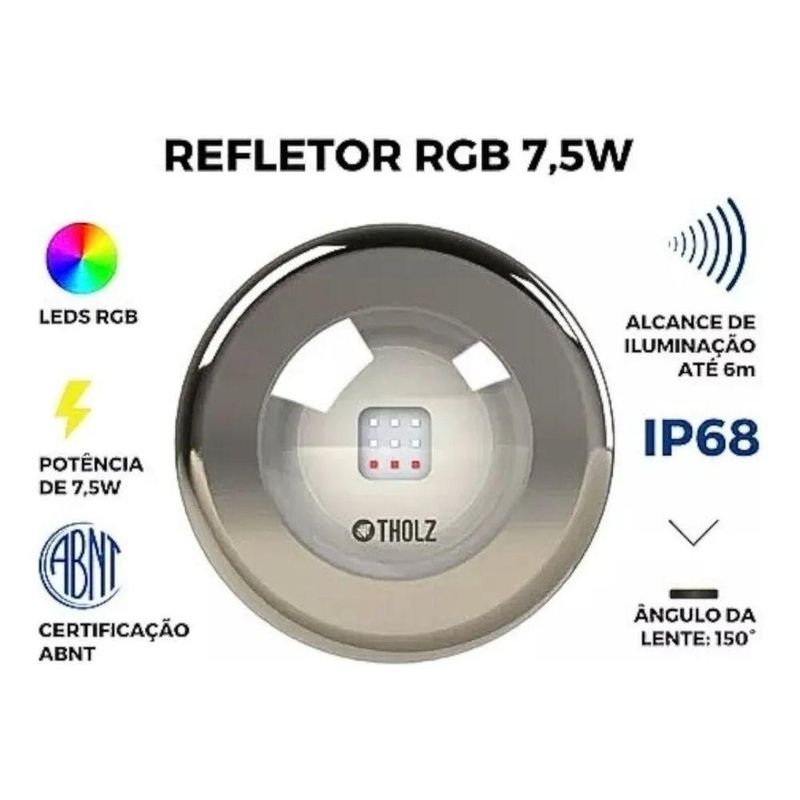 Refletor Led Piscina Inox Rgb 7,5w Tholz 12v Ip68O Refletor LED para Piscina Inox RGB 7,5W Tholz foi desenvolvido para oferecer iluminação eficiente, segura e com alto padrão de acabamento.Fabricado em aço inox, garante maior resistência à água e aos produtos químicos da piscina. Sua tecnologia RGB permite criar diferentes cenários de cores, valorizando o ambiente e proporcionando um efeito visual moderno e sofisticado.Com grau de proteção IP68, é totalmente submersível e ideal para uso contínuo em piscinas residenciais.Especificações TécnicasPotência: 7,5WTensão: 12VTipo de LED: RGMaterial: InoxGrau de proteção: IP68Alcance de iluminação: até 6 mÂngulo da lente: 150°Certificação: ABNTDimensõesComprimento total: 59,0 mmComprimento do corpo: 36,3 mmDiâmetro da lente: 39,0 mmProfundidade do encaixe: 17,5 mmCompatibilidade e InstalaçãoAcompanha adaptador 25 mmAcompanha adaptador rosca 1/2 BSPIdeal para instalação embutida na parede da piscinaRecomendado uso com fonte e controlador compatíveisInstalação deve ser feita por qualificado.Conteúdo da Embalagem1 Refletor LED Piscina Inox RGB 7,5W TholzCabo de ligação (2 metros)Adaptador 25 mmAdaptador rosca 1/2 BSPManual do fabricanteDúvidas Frequentes Pode ficar submerso permanentemente?Sim. Possui proteção IP68. Emite ?Sim. Tecnologia RGB. Precisa de controlador?Sim, para troca de cores é necessário controlador . Serve para piscina de alvenaria?Sim, ideal para piscinas de alvenaria. e IMPORTANTE: disponível para a Sul do .Para as demais regiões, o valor do será negociado após a compra.
