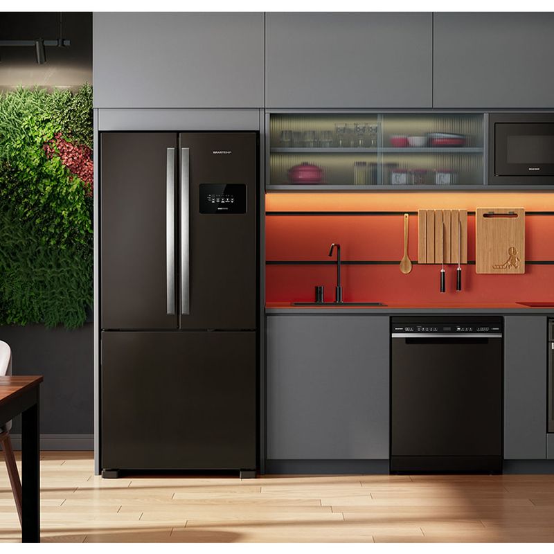 Refrigerador Brastemp Frost Free French Door BRO85ME com compressor Inverter A, que economiza até 25% de energia*. Linha Brastemp Eclipse Collection, com tecnologias funcionais e um design com revestimento na cor Black Inox. A linha oferece produtos integrados esteticamente para você escolher e montar o conjunto perfeito. Abra as portas para um novo mundo de possibilidades e sofisticação. *Quando comparado ao modelo BRO85 com etiqueta A+++ INMETRO 2024, avaliado na norma vigente a partir de 2026. CaracterísticasTipo: French Door Quantidade de Portas: 03Frost FreePainel Eletrônico TouchPrateleiras: 04Alarme de Portas AbertasDegelo AutomáticoPorta GarrafasGavetas: 03Tecnologia de Refrigeração Inverter: SimPés NiveladoresLuz interna Especificações TécnicasModelo: BRO85MECor: Preto Capacidade Total: 559 LitrosCapacidade de Armazenamento do Freezer: 178 LitrosCapacidade de Armazenamento do Refrigerador: 381 LitrosSelo Procel (Eficiência Energética): AConsumo de Energia: 31,3 kWh/mêsVoltagem: 110V/220V (não é Bivolt) EAN: 7891129598683 (110V) / 7891129598690 (220V)Garantia: 12 meses Dimensões e PesoDimensões do produto sem embalagem (AxLxP): 1857x836x793 mmDimensões do produto com embalagem (AxLxP): 1918x871x823 mmPeso do produto sem embalagem: 86,0 KgPeso do produto com embalagem: 90,0 Kg Itens Inclusos01 RefrigeradorManual de Instruções Serviço de Instalação e Orientação de UsoPara sua comodidade, a Fast Shop dispõe do serviço de Instalação* e Orientação de Uso, com equipe especializada e autorizada pelo fabricante que poderá realizar a medição de todos os acessos, retirando as portas do produto caso necessário. Esse serviço pode ser adquirido através do nosso canal Blá pelo WhatsApp no número (11) 3232-2949 ou em uma de nossas lojas. Consulte os valores e regiões atendidas.* Verifique com nossos vendedores se a Fast Shop realiza a instalação desse produto.* A Fast Shop não realiza instalação de produtos a gás (consulte o fabricante).
