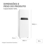 Geladeira Frost Free Midea MDRT572EVD013 Inverter 425L Duplex Branca Bivolt A geladeira Frost Free Duplex 425L da Midea oferece amplo espaço interno e design moderno para facilitar o dia a dia da sua cozinha. Com capacidade total de 425 litros, garante melhor organização dos alimentos e bebidas. A tecnologia Inverter proporciona resfriamento eficiente, baixo ruído e economia de energia, contando com classificação A no novo padrão do INMETRO. O sistema Frost Free realiza o degelo automático, trazendo mais praticidade. Com a função Turbo Freezer, é possível atingir temperaturas mais baixas em menos tempo. O painel eletrônico externo facilita o controle das funções, enquanto a gaveta hortifruti e as prateleiras de vidro auxiliam na organização e na limpeza. Capacidade total de 425L com freezer de 120L Tecnologia Inverter com classificação energética A Sistema Frost Free com degelo automático Função Turbo Freezer Painel eletrônico externo