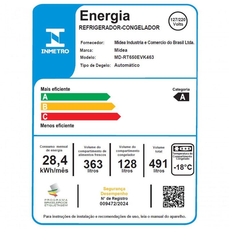 Refrigerador Midea Frost Free - Tecnologia Inverter, controle inteligente e amplo espaço internoO Refrigerador Midea Frost Free Duplex 491L Inverter oferece tecnologia, eficiência e versatilidade para quem busca organização e desempenho. Seu espaço interno é dividido entre refrigerador e freezer, com capacidade total de 491 litros, sendo 128 litros no congelador.Possui o compartimento Extra Freezer, com 45 litros e três níveis de temperatura: -10°C para carnes, -4°C para bebidas e +2°C para frios, adaptando-se conforme a necessidade. A tecnologia Inverter conserva os alimentos com baixo ruído e consumo otimizado. Flexi-volt, funciona em 127V ou 220V.O controle de temperatura pode ser feito pelo painel touch externo ou remotamente, via aplicativo compatível com assistentes de voz. Conta com prateleira retrátil, gaveta para frutas e compartimentos organizados.Especificações Técnicas: Marca: MideaModelo: Inverter MD-RT650EVK463Voltagem: BivoltCor: InoxCapacidade Total: 491 LitrosTipo: DuplexInstalação: PisoSistema de Refrigeração: Frost FreePainel: Digital ExternoControle de Temperatura: EletrônicoCapacidade do Refrigerador: 363 LitrosCapacidade do Freezer: 128 LitrosClassificação Energética: AConsumo de Energia Aproximado: 28,4 kWh/mêsTemperatura mínima do freezer: -24°CPrateleiras Ajustáveis: SimRecursos: Porta Ovos / Porta Latas, Iluminação Interna LED, Compartimento, Extra Frio, Gaveta de HortifrutiFunção: Função Turbo FreezerMaterial das Prateleiras: Vidro + HIPSTipo de Puxador: Integrado Acabamento Externo: Substrato de aço zincado com pintura decorativa aplicada na superfície superiorDimensões do Produto Embalado: 74 L x 190 A x 75 P cmPeso Bruto: 73kgDimensões: 70 L x 185 A x 71,4 P cm Peso: 71kgGarantia: 12 mesesImportante: As imagens podem sofrer variações de acordo com a resolução de seu monitor, iluminação ou ainda, percepção visual.