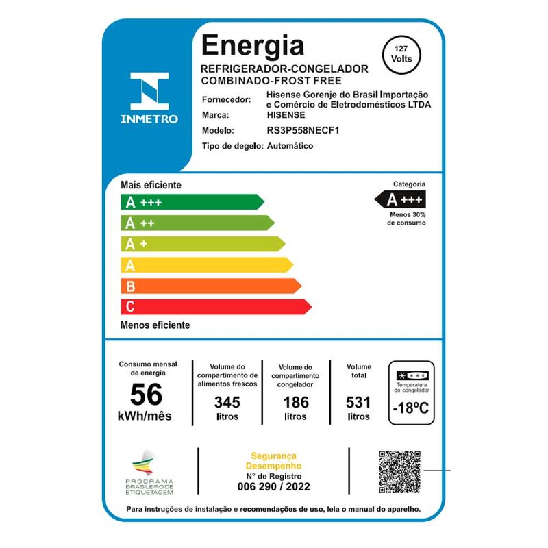 CaracterísticasTipo: Side by SideQuantidade de Portas: 02Frost Free Painel EletrônicoPrateleiras: 07 em VidroAlarme de Portas AbertasFunção Gelo RápidoControle Automático de TemperaturaGavetas: 04Pés Niveladores Especificações TécnicasModelo: RS3P558Cor: InoxCapacidade Total: 531 LitrosCapacidade de Armazenamento do Freezer: 186 LitrosCapacidade de Armazenamento do Refrigerador: 345 LitrosSelo Procel (Eficiência Energética): AConsumo de Energia: 56 kWh/mêsVoltagem: 110V/220V (não é Bivolt) EAN: 6921727093615 (110V) / 6921727087096 (220V)Garantia: 12 meses Dimensões e PesoDimensões do produto sem embalagem (AxLxP): 1786x910x615 mmDimensões do produto com embalagem (AxLxP): 1910x975x679 mmPeso do produto sem embalagem: 81 KgPeso do produto com embalagem: 90 Kg Itens Inclusos01 Refrigerador