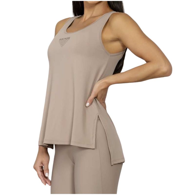 Esta regata apresenta um corte confortável e descontraído. O design incorpora aberturas laterais estratégicas que garantem maior liberdade de movimento. A barra traseira estendida, mais longa que a frontal, oferece cobertura completa do quadril. Um recorte detalhado na parte de trás não só melhora a ventilação, como também permite que o top esportivo fique em evidência. Na frente, destaca-se a identidade visual da marca Run More aplicada em transfer digital, adornada com uma arte em cristais que confere um acabamento elegante e refinado. Esta é uma peça extremamente versátil, ideal para ser usada em sessões de treino ou para compor looks casuais em momentos de lazer. O Material (Luar): Composta por 90% Poliamida e 10% Elastano. O tecido Luar é fino e tem um toque excepcionalmente suave e refrescante. Oferece um excelente ajuste ao corpo, não necessita de passar e proporciona conforto térmico. Graças à tecnologia Dry, o suor é rapidamente transportado para fora e a peça seca velozmente. Possui ainda proteção solar UV50+.
