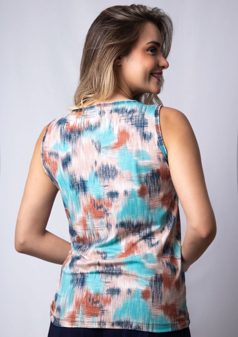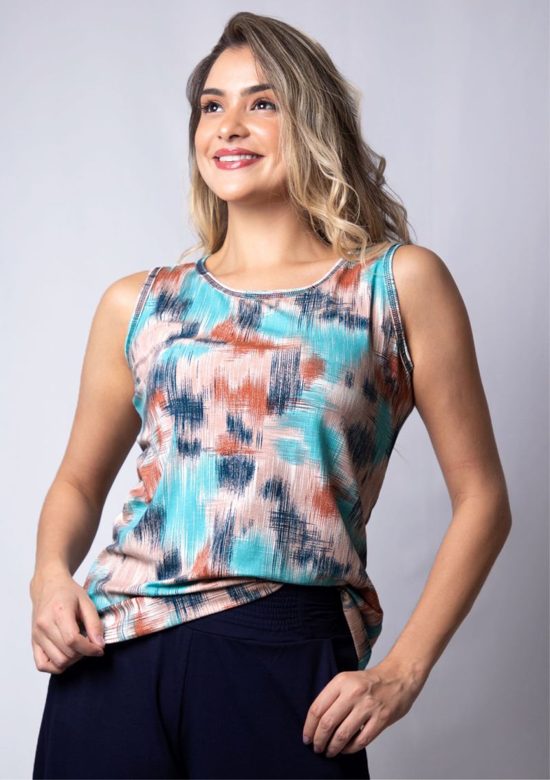 Regata com decote redondo e alças largas, com acabamento em trançador. Construída em malha estampada em bege, turquesa, marinho e marrom. Modelagem soltinha ao corpo. Confortável e despojada. Arrase! Composição da malha: Confeccionado em 94% Viscose e 6% Elastano. Toque macio. Medidas aproximadas: P: 62 x 88 x 90 x 100 cm (Comprimento, Busto, Cintura e Quadril). M: 64 x 94 x 96 x 106 cm (Comprimento, Busto, Cintura e Quadril). G: 66x 100 x 102 x 112 (Comprimento, Busto, Cintura e Quadril). GG: 68 x 106 x 108 x 118 cm (Comprimento, Busto, Cintura e Quadril). XL: 70 x 112x 114 x 124 cm (Comprimento, Busto, Cintura e Quadril). Todos os dados informados são aproximados, do peso às medidas. ATENÇÃO PARA AS MEDIDAS, POIS NOSSA MODELAGEM É AMPLA!