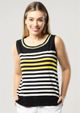 Regata com alças largas e decote redondo Listrado em tons de Preto, Off White e Amarelo. Acabamento do decote em retilínea listrada. Confortável, fresquinha e elegante. Permita-se! Composição da malha: Confeccionado em 95% Viscose e 5% Elastano. Toque macio. Medidas Aproximadas: PP: 57cm Comprimento x 86cm Busto x 86cm Cintura x 92cm Quadril. P: 59cm Comprimento x 92cm Busto x 92cm Cintura x 98cm Quadril. M: 61cm Comprimento x 98cm Busto x 98cm Cintura x 104cm Quadril. G: 63cm Comprimento x 104cm Busto x 104cm Cintura x 110cm Quadril. GG: 65cm Comprimento x 110cm Busto x 110cm Cintura x 116cm Quadril. XL: 67cm Comprimento x 116cm Busto x 116cm Cintura x 122cm Quadril. Todos os dados informados são aproximados, do peso às medidas. ATENÇÃO PARA AS MEDIDAS. MODELAGEM AMPLA. *Modelo está usando o tamanho P*