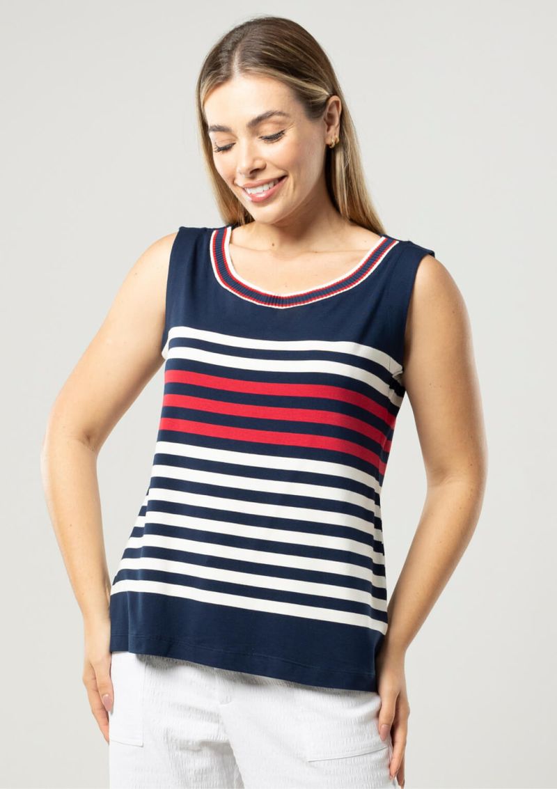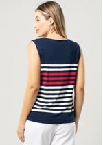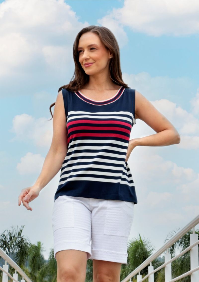 Blusa regata com alças largas e decote redondo. Listrado em tons de Azul Marinho, Off White e Vermelho. Acabamento do decote em retilínea listrada. Confortável, fresquinha e elegante. Permita-se! Composição da malha: Confeccionado em 95% Viscose e 5% Elastano. Toque macio. Medidas Aproximadas: PP: 57cm Comprimento x 86cm Busto x 86cm Cintura x 92cm Quadril. P: 59cm Comprimento x 92cm Busto x 92cm Cintura x 98cm Quadril. M: 61cm Comprimento x 98cm Busto x 98cm Cintura x 104cm Quadril. G: 63cm Comprimento x 104cm Busto x 104cm Cintura x 110cm Quadril. GG: 65cm Comprimento x 110cm Busto x 110cm Cintura x 116cm Quadril. XL: 67cm Comprimento x 116cm Busto x 116cm Cintura x 122cm Quadril. Todos os dados informados são aproximados, do peso às medidas. ATENÇÃO PARA AS MEDIDAS. MODELAGEM AMPLA. *Modelo está usando o tamanho P*