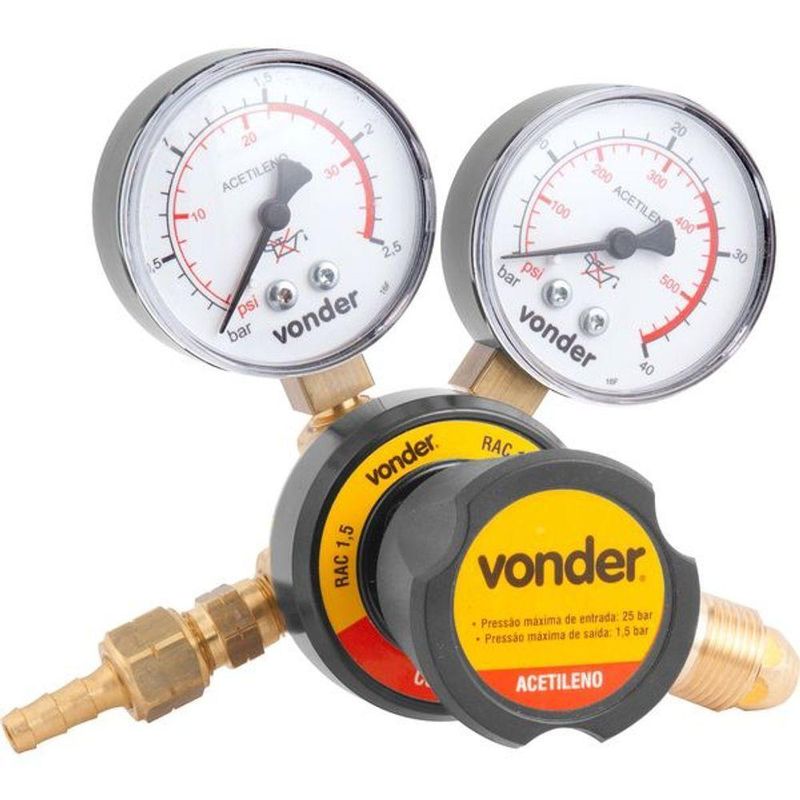 Regulador De Pressão Acetileno Rac1,5 - VonderConteúdo da embalagem1 Regulador de pressão. Acompanha: 1 conjunto de porca e niple para conexão em mangueiras.Aplicações e dicas de usoIndicado para uso com acetileno em aplicações industriais de solda, corte e aquecimento. Linha média.Destaques e diferenciaisPossui corpo em latão forjado e capa em alumínio injetado com pintura epóxi, proporcionando maior resistência. Atende as exigências das normas EN-2503 / ABNT 14250 / ABNT 225-2 e CGA E1-22.DETALHES TÉCNICOS Tipo de gás do regulador de pressão para gases de solda Acetileno Pressão máxima de entrada: 25 bar Pressão máxima de saída: 1,5 bar Escala do manômetro de entrada do regulador de pressão para gases de solda: 0 - 40 bar / 0 - 600 Lbf/pol² (Psi) Escala do manômetro de saída do regulador de pressão para gases de solda: 0 - 2,5 bar / 0 - 35 Lbf/pol² (Psi) Diâmetro do manômetro do regulador de pressão para gases de solda: 63,5 mm Produto: Regulador