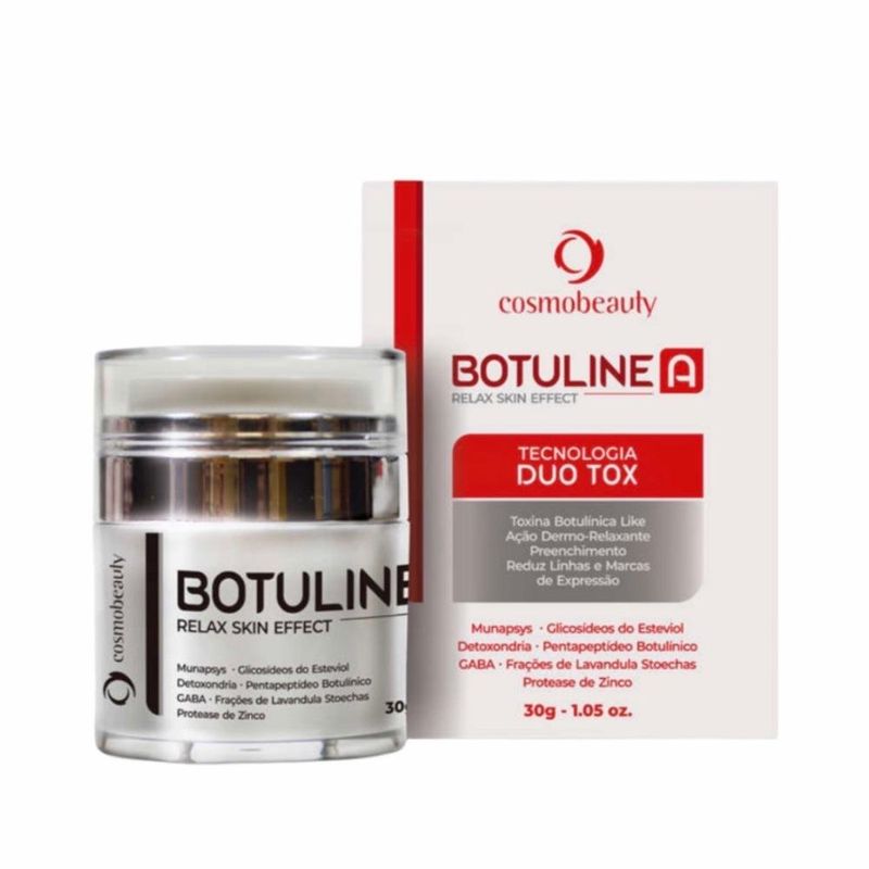 Rejuvenescedor Tópico Botuline A Duo Tox Cosmobeauty 30gRejuvenescedor Tópico Botuline A Duo Tox Cosmobeauty, atua na suavização das linhas e vincos de expressão, proporcionando uma pele revitalizada e radiante.Com ingredientes modernos e altamente eficazes, possui tecnologia Duo Tox, sendo duplamente indicado para auxiliar no pré e pós aplicação de toxina botulínica, prolongando os resultados. Possui também o efeito Relax Skin Effect que reduz a memória de contração da pele evitando formação e acentuação das rugas.Composição: Munapsys Glicosídeos do esteviol Detoxondria Pentapeptídeo botulínico Gaba Frações de lavandula stoechas Protease de zinco.Modo de usar:Aplicar o Botuline A Duo Tox sobre a pele limpa e seca, massagear até completa absorção. Usar duas vezes ao dia.