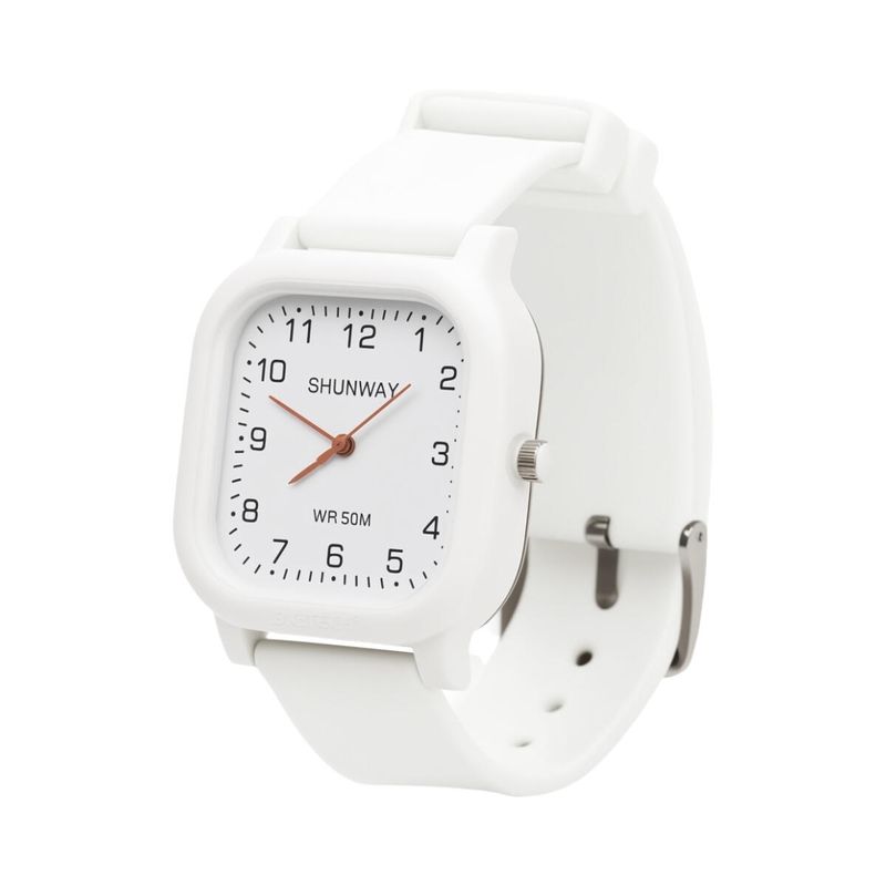 Relógio S581-02-1 Relógio de pulso analógico com design minimalista na cor branca. Possui mostrador com números grandes de fácil leitura, ponteiros precisos e pulseira confortável em silicone. Ideal para uso diário, combinando estilo simples e moderno. Resistente à água até 50 metros, adequado para atividades do dia a dia. Funcionamento por bateria.