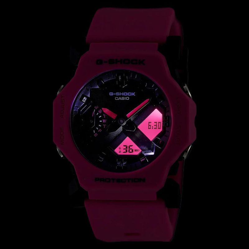 DESCRIÇÃO DO PRODUTO: Visor: LCD Funções: Calendário, Anadigi, Horário Mundial (GMT) com função horário de verão, Cronógrafo (Modos de medição: tempo decorrido, tempo parcial, tempos do 1º e 2º lugares), Timer, 5 Alarmes Diários, Sinalização Horária, Iluminação, Recurso de mudança do ponteiro (os ponteiros se afastam para fornecer uma visão desobstruída do conteúdo do visor digital).Resistência à Água: 200mDiâmetro da Caixa: 42 mmCaracterísticas: com caixa em Resina Pink/Preta e pulseira em Poliuretano PinkVidro: MineralEstilo: EsportivoFundo: ParafusadoLinha: Casio G-ShockMostrador Pink com Detalhes em PretoGarantia de 1 Ano
