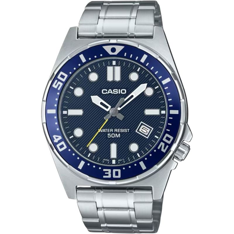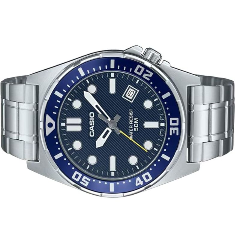 Informações Do Relógio Marca Casio número da peça MTD-135D-2AVDF Forma Redondo Cristal Vidro Tipo de tela ou mostrador Análogico - Digital Fecho Fecho dobrável Material da caixa Metal Diâmetro da caixa 43.6 milímetros Espessura da caixa 9.3 milímetros Material da faixa, pulseira ou tira Aço inoxidável Tamanho da banda Unisex Largura da faixa, pulseira ou tira 43.6 milímetros Cor da faixa, pulseira ou tira Prateado Cor do mostrador Azul Tipo de material do bisel Metal Função do bisel Formato de 12 horas Tipo de calendário Dia-Data-Mês Características especiais Resistente à água Peso 126 g Movimento do relógio Analógico Resistência à água 50 Metros