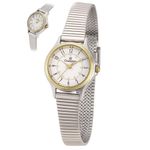 DESCRIÇÃO DO PRODUTO: Caixa Em MetalPulseira Em AçoVidro de Cristal MineralFundo RosqueadoResistente à Água 5 AtmDiâmetro / Largura da Caixa: 26.00 MMFunções: AnalógicoMostrador Branco com todos númerosAlimentação do Maquinário: BateriaPrateado com DouradoGarantia de 1 Ano