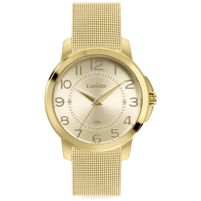 DESCRIÇÃO DO PRODUTO: Caixa de MetalPulseira de Malha de Aço MeshVidro de Cristal MineralFundo PressãoResistente à Água 5 AtmDiâmetro / Largura da Caixa: 38.00 MM Alimentação do Maquinário: Bateria Maquina JaponesaMostrador Dourado com todos os números e pedrasGarantia de 1 Ano