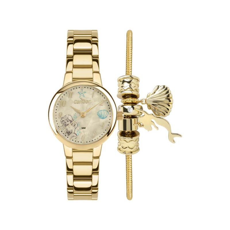 DESCRIÇÃO DO PRODUTO: Caixa de MetalPulseira de AçoVidro de Cristal MineralFundo PressãoResistente à Água 5 AtmDiâmetro / Largura da Caixa: 25.00 MM Alimentação do Maquinário: Bateria Maquina JaponesaMostrador estilo madreperola bege com numeros e detalhes da personagem Ariel da animação A Pequena Sereia+ Pulseira e berloques semijóiaPRODUTO OFICIAL LICENCIADO DISNEY Garantia de 1 Ano