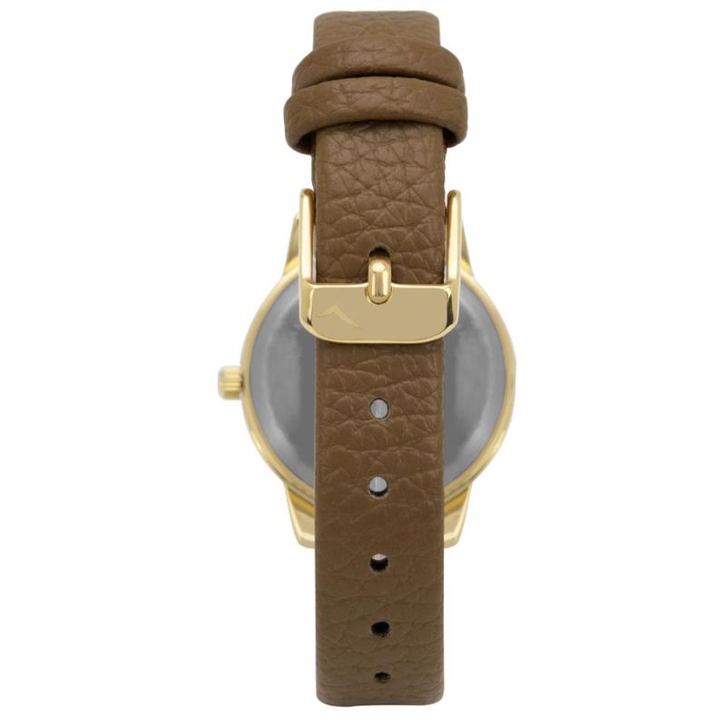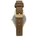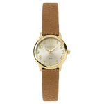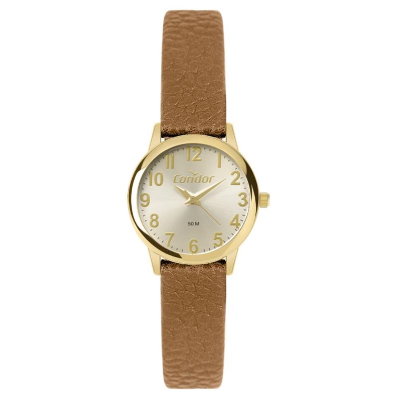 DESCRIÇÃO DO PRODUTO: Caixa de MetalPulseira de Couro Ecológico MarromVidro de Cristal MineralFundo PressãoResistente à Água 5 AtmDiâmetro / Largura da Caixa: 30.00 MM Alimentação do Maquinário: Bateria Maquina JaponesaMostrador Dourado com todos os números Garantia de 1 Ano