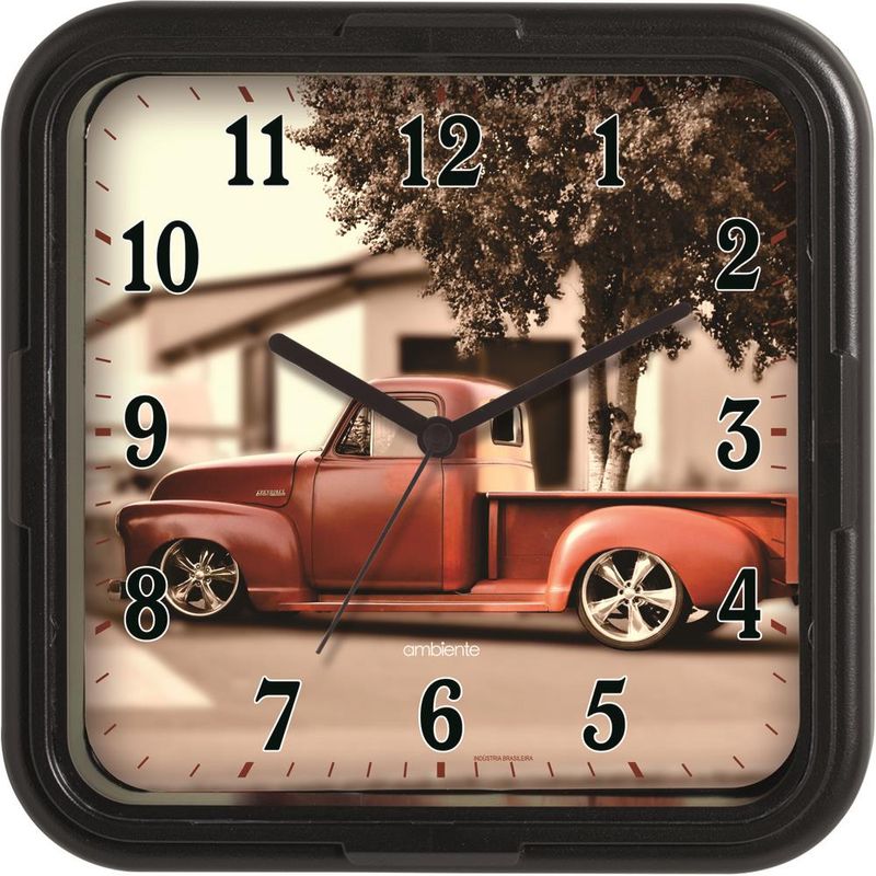 DESCRIÇÃO DO PRODUTO: Medidas: 22,6A 22,6L x 4E cmCaracterísticas Técnicas:Usa pilha AAMecanismo Step (Tic-Tac)Produto Nacional Informações sobre o produto:Relógio de parede Base em Plástico InjetadoBotões de regulagem na parte traseira do produtoVidro: AcrílicoCor da Base: Preto Mostrador: Caminhonete Hot RodIdeal para decoração de ambientesGarantia de 1 ano