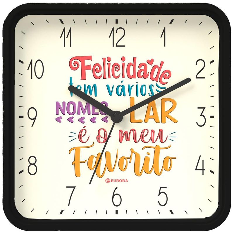 DESCRIÇÃO DO PRODUTO: Medidas: 22A x 22 L 3,2E cmCaracterísticas Técnicas:Usa pilha AAMecanismo Step (Tic-Tac)Produto Nacional Informações sobre o produto:Relógio de parede Base em Plástico InjetadoBotões de regulagem na parte traseira do produtoCor da Base: Preto Cor do Mostrador: bege com inscrição Felicidade tem vários nomes Lar é o meu favorito e números em pretoPara a decoração do seu larGarantia de 1 ano