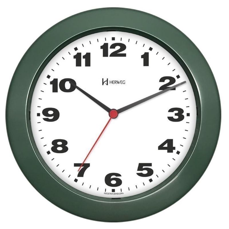 DESCRIÇÃO DO PRODUTO: Medidas: 21D x 3E cmCaracterísticas Técnicas:Usa pilha AAMecanismo Step (Tic-Tac)Produto Nacional Informações sobre o produto:Relógio de parede Base em Plástico InjetadoBotões de regulagem na parte traseira do produtoCor da Base: Verde Samaúma Cor do Mostrador: Branco com númerosGarantia de 1 ano