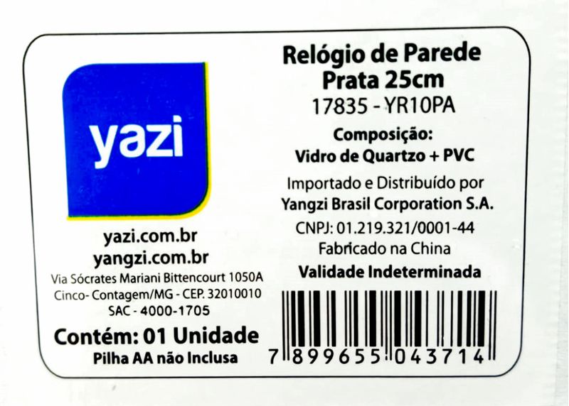 Relógios de parede Yazi Prata ou Branco 25cm 17835/17836 - YR10PA/YR10BR Composição: PVC + Vidro + Quartzo Fabricante: Yangzi Marca: Yazi Tamanho: 25 x 5 x 25cm Relógio de parede que combina com qualquer ambiente. Ótimo para ser utilizado em estabelecimentos e áreas comuns residenciais.