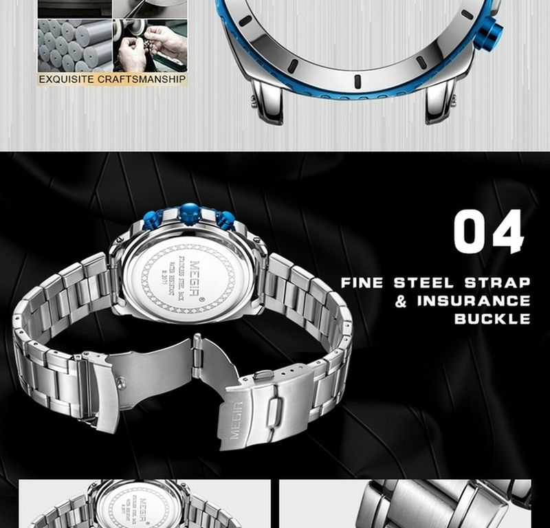 Relógio de Pulso Masculino MEGIR 2075 À Prova D'Água O Relógio de Pulso Masculino MEGIR 2075 é uma escolha robusta e funcional para homens que desejam um acessório resistente à água. Abaixo estão algumas das características principais e considerações sobre este modelo: ### Características Principais: 1. **Design Elegante e Versátil:** - O MEGIR 2075 apresenta um design moderno e sofisticado, com detalhes que conferem um visual elegante e versátil. Seu estilo é adequado para uma ampla variedade de ocasiões, desde o uso diário até eventos mais formais. 2. **Movimento de Quartzo Preciso:** - Equipado com um movimento de quartzo de alta qualidade, o relógio oferece uma medição precisa do tempo. Esse tipo de movimento é conhecido por sua confiabilidade e precisão. 3. **Resistência à Água:** - O MEGIR 2075 é projetado para ser à prova d'água, resistindo a exposições moderadas à água, como respingos, chuva e lavagem das mãos. No entanto, não é recomendado submergir o relógio em água profunda ou usá-lo durante atividades aquáticas intensas. 4. **Material Durável:** - A caixa e a pulseira do relógio são feitas de materiais duráveis, como aço inoxidável e couro de alta qualidade, proporcionando resistência ao desgaste diário e uma aparência elegante ao longo do tempo. 5. **Mostrador Funcional:** - O mostrador do relógio pode incluir funcionalidades adicionais, como indicadores de data e marcadores de hora luminosos, aumentando a praticidade e a visibilidade em diferentes condições de iluminação. 6. **Versatilidade:** - Com seu design versátil, o MEGIR 2075 pode ser facilmente combinado com diferentes estilos de roupas, desde roupas casuais até trajes mais formais, sendo uma excelente escolha para diversas ocasiões. ### Considerações Adicionais: - **Manutenção Regular:** - Para garantir a longevidade do relógio, é importante realizar uma limpeza regular e manter o relógio seco após a exposição à água ou sujeira. - **Limitações de Resistência:** - Embora o relógio seja resistente à água, evite submergi-lo em água profunda ou expô-lo a atividades aquáticas intensas para evitar danos ao mecanismo interno. ### Conclusão: O Relógio de Pulso Masculino MEGIR 2075 oferece estilo, funcionalidade e resistência à água em um único pacote. Com seu design elegante, materiais duráveis e recursos práticos, é uma excelente escolha para homens que procuram um relógio versátil para uso diário.