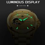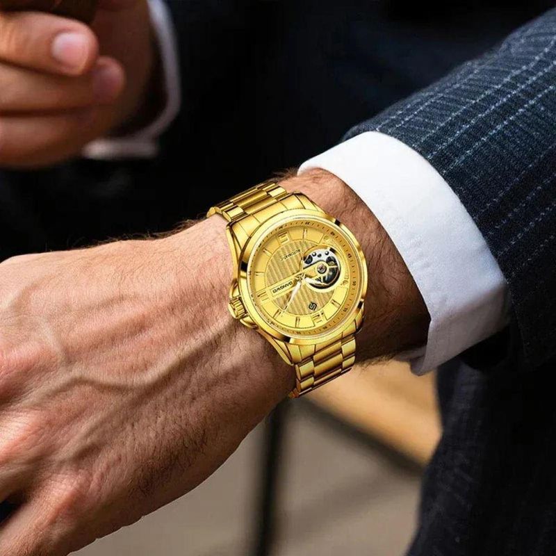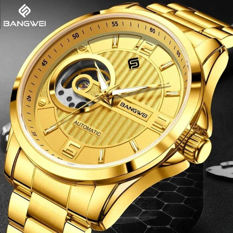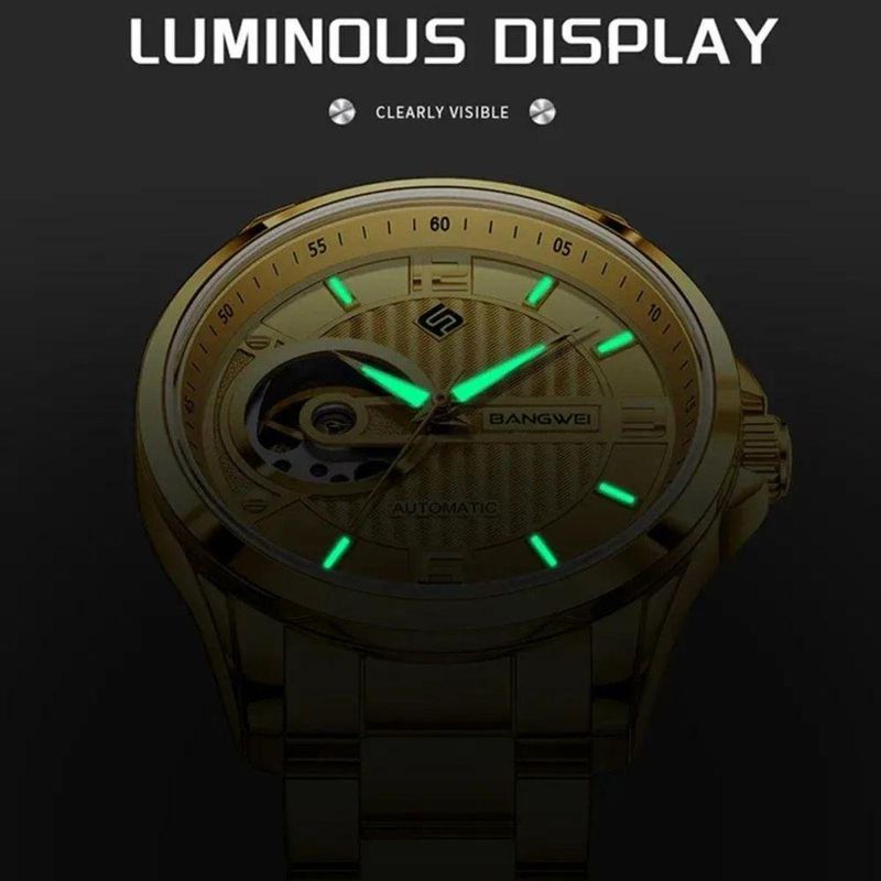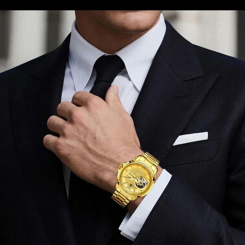 Relógio De Pulso Mecânicos Masculinos Marca Superior Luxo Automático DouradoExplore um mundo de sofisticação com um relógio que combina perfeitamente luxo e funcionalidade. Apresentando um design mecânico automático, o relógio se destaca por sua hipnotizante complicação tourbillon. Feito para os aventureiros urbanos, a fusão de moda e robustez garante que você terá a companhia ideal, tanto para eventos sociais quanto para mergulhos audaciosos.Cada detalhe deste relógio foi projetado para impressionar. Com um mostrador luminoso que brilha intensamente sob qualquer luz, proporciona facilidade ao ler as horas em diferentes ambientes. A elegância deste relógio é aprimorada pelo seu mostrador em formato arredondado, perfeito para quem valoriza o design clássico e sofisticado.Especificações [Química Avançada]: Oferecendo uma profundidade de resistência à água de 3Bar, é ideal para atividades ao ar livre, garantindo proteção sob condições úmidas. [Construção de Qualidade]: O tipo de aço inoxidável da pulseira e do estojo asseguram durabilidade, enquanto o hardlex proporciona proteção adicional contra choques e arranhões. [Inovação Visual]: Com um mostrador entre 40 a 44 mm, cada segundo sob a lente hardlex é uma experiência visual. [Conforto Reimaginado]: A largura da banda varia entre 20 e 24 mm, complementada por um fecho com botão oculto que oferece um ajuste seguro e personalizado. [Moda e Funcionalidade]: Estilo fashion e casual fundem-se em um movimento automático que resfria sozinho, promovendo precisão e conforto enquanto você navega pelo ritmo acelerado da vida.