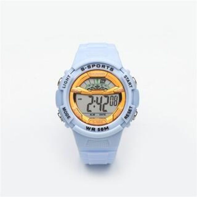 Relógio S506-08-1 Adicione um toque de cor e funcionalidade ao seu pulso com este relógio digital esportivo da Shunway, modelo S-506. Ele combina um design robusto em azul claro com detalhes elegantes em dourado, perfeito para o dia a dia e atividades físicas.