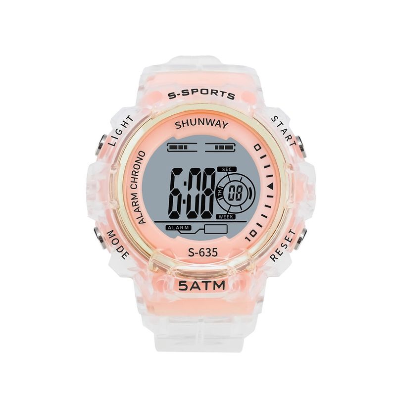 Relógio S635-03-1 Relógio de pulso digital com design esportivo moderno, em rose Possui visor digital de fácil leitura com funções de hora, minutos, segundos, dia da semana, cronômetro e alarme. Conta também com iluminação noturna e botões laterais para fácil ajuste. Resistente à água até 5ATM (50 metros), ideal para uso diário, esportes e lazer. Funcionamento por bateria.