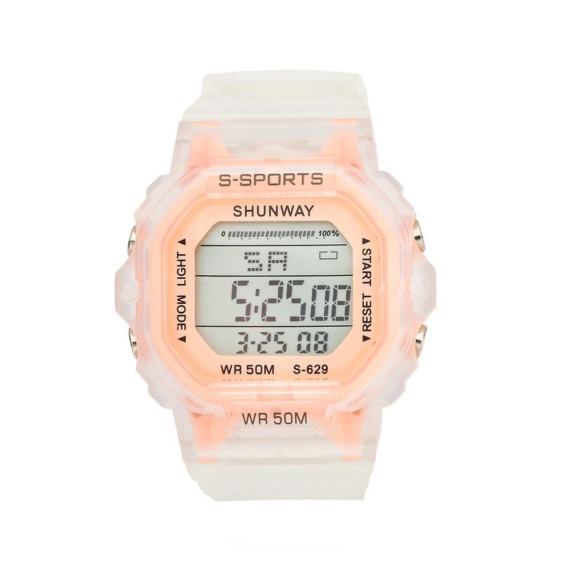 Relógio Feminino S629-03-1 O Relógio Digital Feminino Shunway S-Sports é a escolha ideal para quem busca estilo moderno com toque esportivo. Com design transparente e detalhes em tom delicado, ele traz leveza e personalidade ao visual, combinando perfeitamente com looks casuais e esportivos. Possui visor digital de fácil leitura, com exibição de horas, minutos, segundos e calendário. Conta com funções como alarme, cronômetro e iluminação (light), oferecendo praticidade para o dia a dia. Resistente à água até 50 metros (WR 50M), é indicado para uso diário e respingos, garantindo mais segurança e durabilidade. A pulseira em material confortável proporciona ótimo ajuste ao pulso, tornando-o perfeito para quem quer unir funcionalidade e estilo em um só acessório.