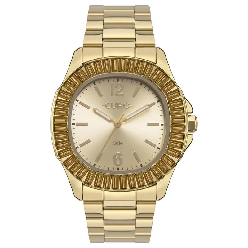 DESCRIÇÃO DO PRODUTO: Caixa de MetalPulseira de AçoVidro de Cristal MineralFundo PressãoResistente à Água Até 5 AtmDiâmetro / Largura da Caixa: 41.00 MMFunções: AnalógicoAro Externo de pedrasMostrador dourado com númerosAlimentação do Maquinário: BateriaMaquina Japonesa Garantia de 1 Ano