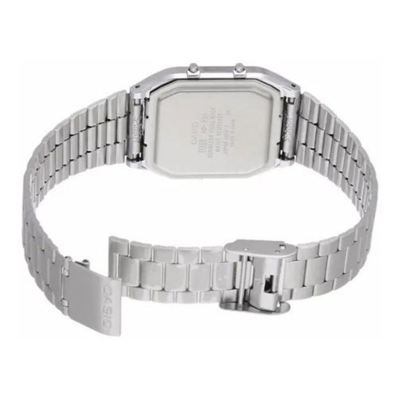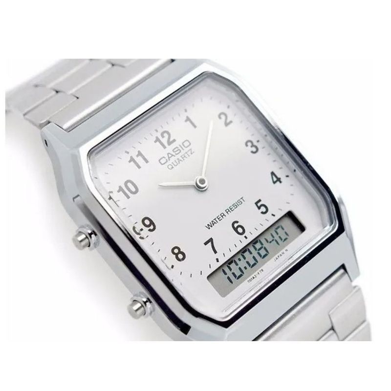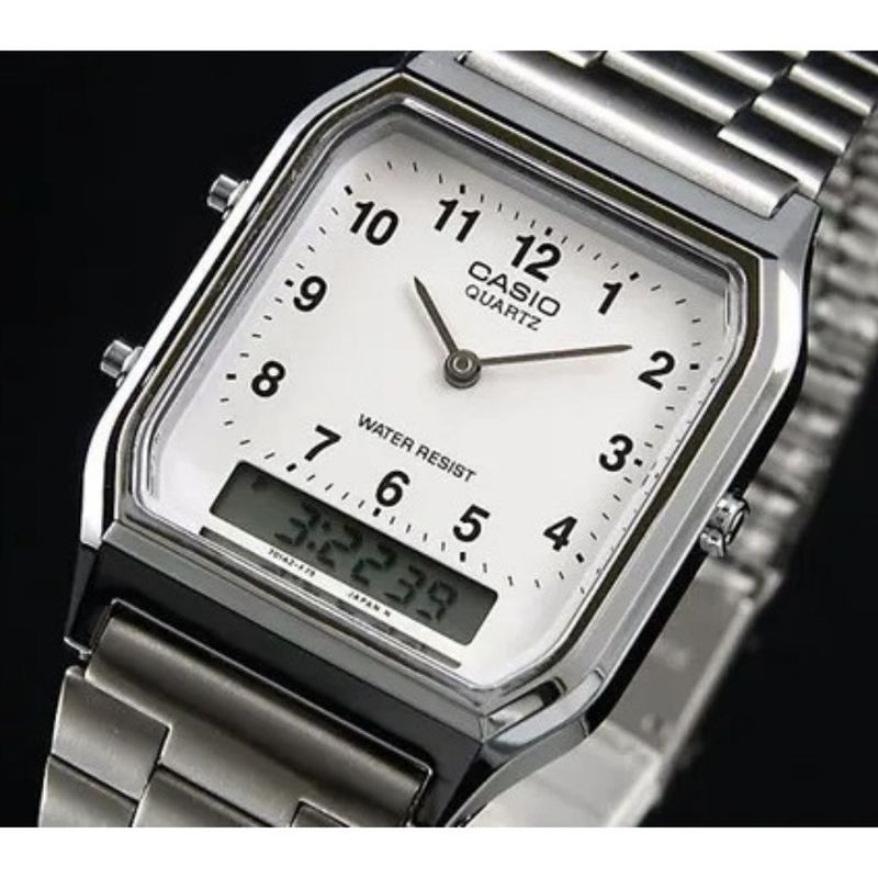 Descrição Marca: Casio Fabricante: Casio Referência: AQ-230A-7BMQ Genêro: Unisex Mecanismo: Digital/Analógico (Quartzo) Alimentação: Bateria Composição do Vidro: Acrílico Material da Caixa: Resina Material da Pulseira: Aço Inoxidável Tampa Fundo: Pressão Largura da Caixa: 2,9 cm Espessura da Caixa: 0,8 cm Funções: Calendário, Alarmes, Cronômetro, Iluminação, Hora Dupla Resistência à Água: 1 ATM - 10 Mts (Pode lavar as mãos e aguenta respingos)