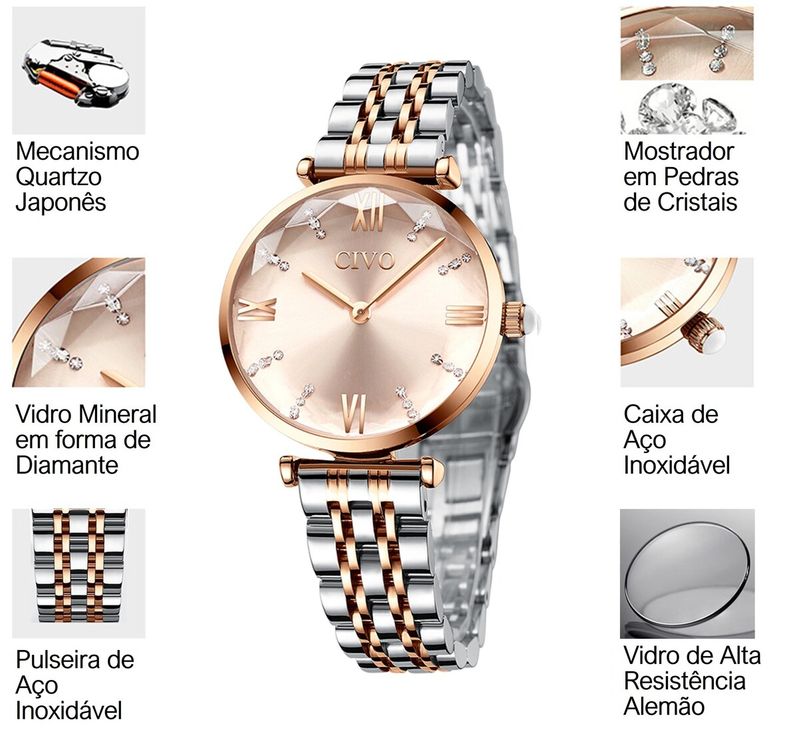 Somente uma empresa especializada como a DELTA JÓIAS E RELÓGIOS para trazer ao Brasil com EXCLUSIVIDADE os famosos e maravilhosos RELÓGIOS FEMININOS CIVO que estão fazendo muito sucesso na Europa, Austrália e Estados Unidos pelos seus DESIGN, ESTILO, BELEZA, TECNOLOGIA e QUALIDADE. As MULHERES mostram toda sua ELEGÂNCIA. ESTILO, BELEZA e REQUINTE usando os RELÓGIOS FEMININOS CIVO e que MÃE não iria adorar ganhar um PRESENTE como este. SURPREENDA-AS. Marca: CIVO Gênero: Feminino CARACTERÍSTICAS: Vidro: Cristal Mineral de Alta Resistência (Origem Alemanha) Material da Caixa: Aço Inoxidável Material da Pulseira: Aço Inoxidável de Alta Qualidade Modelo: Analógico Mecanismo: Quartzo (Origem Japão) Alimentação: Bateria de Lithium de Longa Duração (Origem Japão) Resistência à Água: 3 ATM (não utilizar para mergulho) Peso: 63 g Diâmetro da Caixa: 3,2 cm Espessura da Caixa: 0,9 cm Comprimento da Pulseira: 17,0 cm (ajustável) Largura da Pulseira: 1,4 cm GARANTIA de 90 (noventa) dias contra defeito de fabricação. CUIDADOS COM SEU RELÓGIO FEMININO CIVO: - Evite o contato do relógio com cosméticos, perfumes, umidade, água do mar, areia da praia e qualquer produto abrasivo - Retire o relógio quando for tomar banho de chuveiro ou piscina, a fim de evitar o contato com produtos de limpeza, higiene pessoal e produtos químicos - Ao fazer serviços que utilizam produtos químicos e de limpeza, evite usar o relógio - Limpar o relógio com uma flanela seca - Guardar em lugar sem umidade e separadamente de outras peças para evitar o atrito entre elas e riscar o relógio Produto em PRONTA-ENTREGA. Despachamos para todo o Brasil em no máximo 24 horas após confirmação da sua compra.