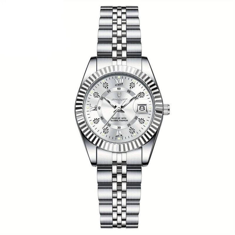 Relógio Feminino Elegante Com Strass Em Aço Inoxidável De Quartzo Casual Branco Prateado Descrição do Produto:Descubra a sofisticação atemporal. Com um design que alia aparência clássica a funcionalidades modernas, esta peça é feita sob medida para mulheres que valorizam o estilo e a eficiência. O mostrador analógico é destacado por detalhes cuidadosamente projetados, que incluem uma data luminosa, perfeita para visualizar em qualquer condição de iluminação. Seu acabamento em aço inoxidável proporciona durabilidade e um toque de glamour inquestionável, elevando o Relógio Feminino a um acessório essencial para o dia a dia, seja em encontros ocasionais ou compromissos corporativos.Este relógio é movido por um preciso sistema de quartzo, garantindo pontualidade e confiabilidade. A liga de zinco utilizada na construção do estojo confere leveza sem comprometer a robustez, enquanto a pulseira em aço inoxidável oferece conforto e estilo. Cada elemento foi escolhido para compor um visual que se destaca, garantindo que se torne rapidamente a peça central de qualquer conjunto. Especificações: [Movimento preciso] Os relógios de quartzo são sinônimo de precisão e eficiência, oferecendo a segurança de um tempo sempre acurado para qualquer ocasião. [Material duradouro] Com um estojo feito de liga de zinco e uma resistente pulseira de aço inoxidável, este relógio feminino combina robustez e design leve para o cotidiano. [Estilo marcante] Com um formato redondo e moderno, projetado para atender às exigências do estilo casual, este relógio se adapta a qualquer ambiente. [Bateria confiável] Equipado com uma bateria tipo botão que, apesar de não ser recarregável, oferece longo tempo de operação sem preocupações. [Proteção adicional] Resistente à água até 3 ATM, este relógio proporciona tranquilidade em situações ocasionais de contato com a água, como chuva e respingos.