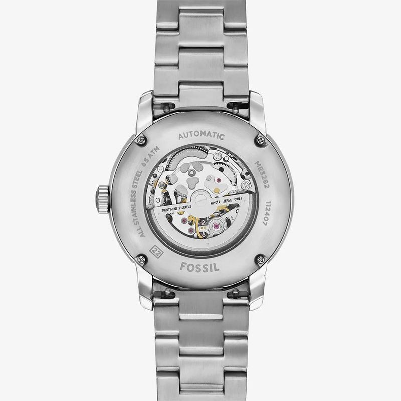 Descrição do Produto: Caixa de Aço InoxPulseira de Aço InoxFundo Parafusado com detalhe de vidro que permite a visualização do maquinárioResistente à Água 5 ATMDiâmetro / Largura da Caixa: 42.00 MMAltura / Espessura da Caixa: 15.00 MMFunções: Analógico, Automático EsqueletoAlimentação do Maquinário: Mecânico (Automático)Vidro: Cristal MineralMostrador Verde com números e detalhe transparente que permite a visualização do maquinárioLinha: Fossil HeritageGarantia de 2 Anos