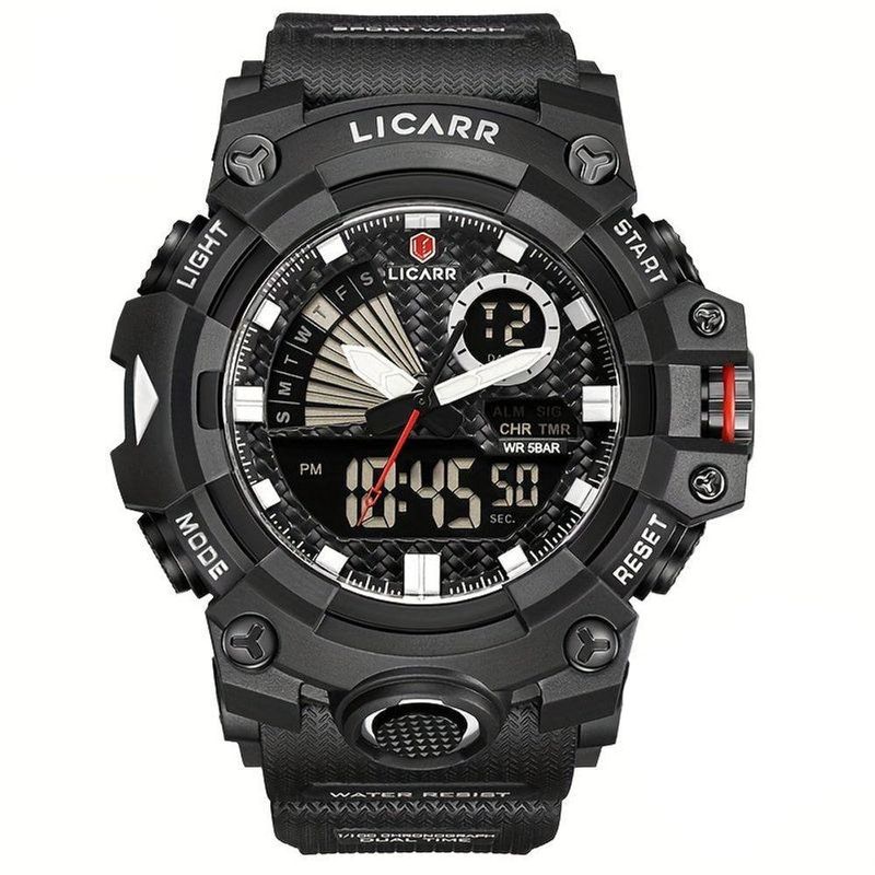 Relógio Licarr Top Luxury - Cronômetro à Prova D'água, Quartzo 9532 PrateadoDescubra a combinação perfeita entre elegância e tecnologia com o Relógio de Pulso Esportivo Masculino LICARR Top Luxury. Este acessório não serve apenas para marcar as horas, mas transforma o jeito de encarar seu tempo com estilo. Ideal para quem vive intensamente e precisa de um item que acompanhe o seu ritmo, este relógio de quartzo une funcionalidade e design, proporcionando sofisticação em todas as ocasiões.Com um cronômetro à prova d?água, você poderá desafiar limites sem preocupação. Feito com materiais de alta qualidade, como a resina sintética na estrutura e borracha na correia, o relógio oferece durabilidade e conforto. O design redondo do mostrador traz um visual moderno, sem abrir mão da resistência com 5 ATM, pronto para aventuras aquáticas ou urbanas. Especificações: [Material do Estojo] Construído a partir de resina sintética robusta, o estojo do relógio é sinônimo de resistência e estilo duradouro. Suas propriedades garantem um visual sofisticado enquanto suportam o desgaste diário. [Desempenho Resistente] Com resistência à água de até 5 ATM, este relógio é o companheiro ideal para atividades ao ar livre, desde uma corrida sob chuva até um mergulho. Faça muito mais sem se preocupar. [Design Esportivo] Os materiais de borracha e resina complementam um design esportivo e moderno, pensado para aventuras urbanas e atividades intensas. Versátil e estiloso, adapta-se a diferentes estilos de vida. [Movimento Precisão] Equipado com movimento de quartzo, este relógio oferece precisão inigualável e confiabilidade, garantindo que você nunca perca uma batida ou compromisso importante. [Dual Display] Tecnicamente avançado, o duplo modo de exibição eletrônica é um destaque inteligente, proporcionando acesso fácil e rápido às informações que você precisa, em qualquer situação.
