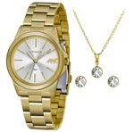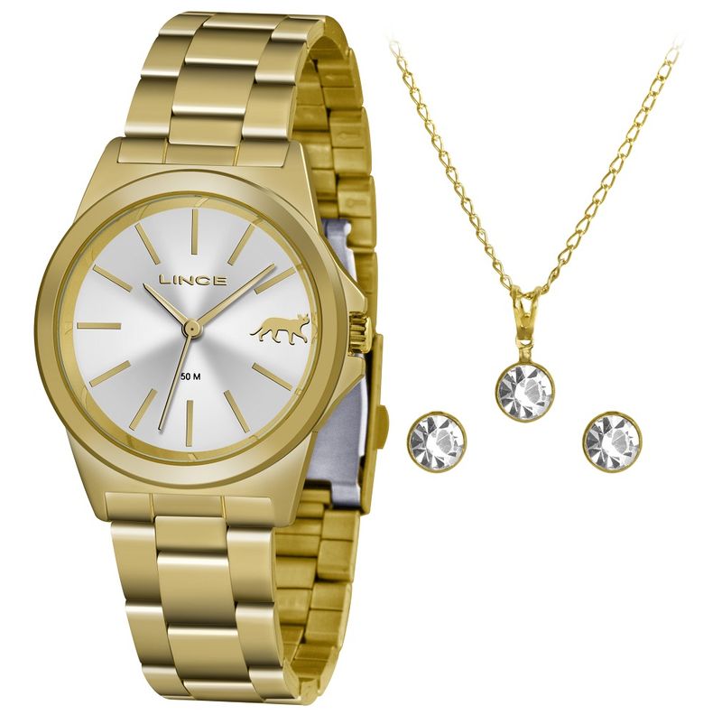 Kit relógio feminino com sistema analógico com ponteiros indicando as horas, minutos e segundos. Caixa em metal com vidro em cristal mineral e pino para ajuste de horas. Mostrador personalizado, possui indicadores tracejados e um simbolo de lince. Pulseira em aço trabalhado com fechamento por mola. Acompanha colar e par de brincos. Resiste à água: 5ATM Composição do Vidro: cristal mineral Material da Caixa: metal Material da Pulseira: aço Medidas proximadas: - Largura da caixa, incluindo pino: 3,8cm - Espessura da caixa: 0,8cm - Comprimento da pulseira: 19cm Informações Adicionais: Tamanho: únicoCor: dourado Modelo: Kit Relógio Feminino Lince LRGH125L KX23S1KX Material: aço Detalhes adicionais: Fashion Marca: Lince