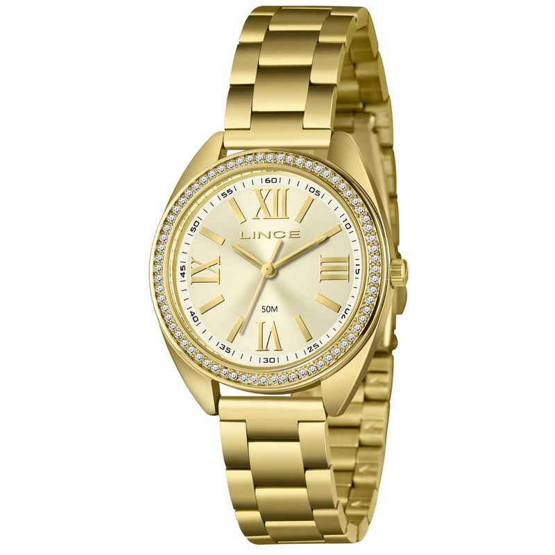 DESCRIÇÃO DO PRODUTO: Caixa: MetalPulseira: AçoMedida da caixa: 36 mmVidro: Cristal MineralResistência à água: 50mFunções: AnalógicoMostrador Dourado com algarismos romanosAro externo de pedrasFundo de PressãoAlimentação do Maquinário: BateriaMaquinário JaponêsGarantia de 1 Ano