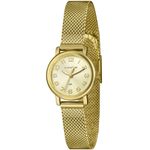 DESCRIÇÃO DO PRODUTO: Caixa: MetalPulseira: Malha de Aço MeshMedida da caixa: 25 mmVidro: Cristal MineralResistência à água: 50mFunções: AnalógicoMostrador Dourado com todos os númerosFundo de PressãoAlimentação do Maquinário: BateriaMaquinário JaponêsGarantia de 1 Ano
