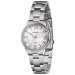 DESCRIÇÃO DO PRODUTO: Caixa: MetalPulseira: AçoMedida da caixa: 32 mmVidro: Cristal MineralResistência à água: 50mFunções: AnalógicoMostrador estilo madreperola branca com númerosFundo de PressãoAlimentação do Maquinário: BateriaMaquinário JaponêsGarantia de 1 Ano